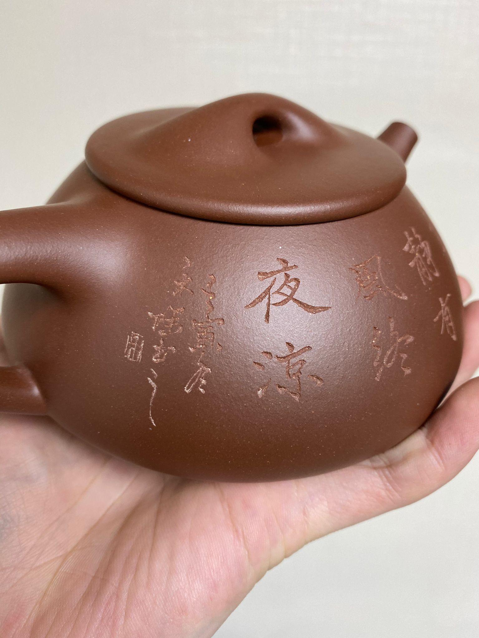 Outstanding workmanship and appearance . A wonderful addition to my prevous purchases and an enhancement to my tea experience . Caligraphy , artistry , poem , and the Hei Zi Ni clay , make every session quite pleasant !!