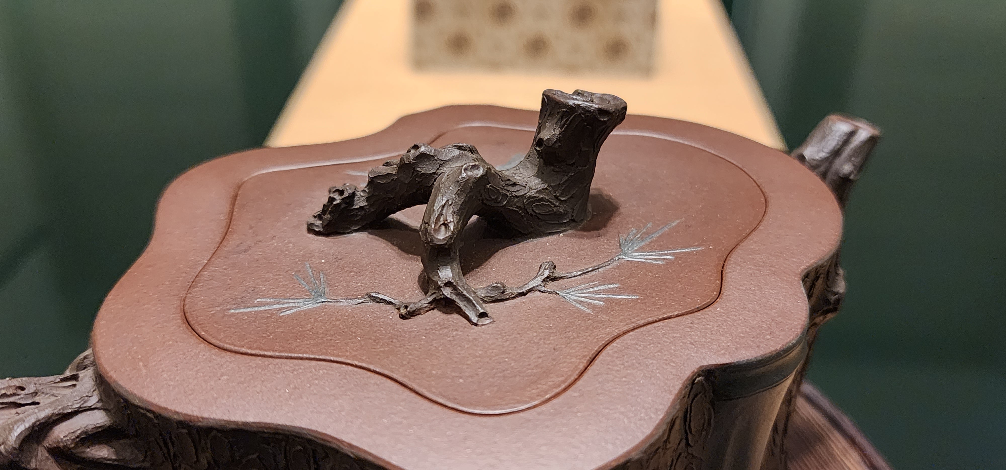 a) the lid: brown branch vs green leaves vs lighter QingShuiNi background;