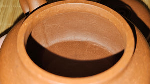 Also to be cherished and witnessed in this ZiSha Work, you observe: besides the usual important, critical and beautiful hallmarks of a Fully-Handmade ZiSha pot, this pot has the discontinuous and roughly horizontal marks evident on the inner walls, and these are called the: 泥凳纹 Ni Deng Wen, which are the marks left on the clay slab, complementary to the marks on the workbench of the Craftsman Wan. During the making of FHM ZiSha pots, the Craftladies and Craftsmen will be using tools to cut the clay slabs, etc, and these cutting strokes will leave marks on the studio workbench. Especially the first major forceful cut across the table to delineate the clay she/he wants to utilize to form the main body of the body. Thus when the craftsman subsequently pound the clay slab on the workbench, these marks will be etched onto the clay slab. Thus you are "enjoying" the additional natural hallmarks of a Fully-Handmade pot. Even a partially handmade pot will not show these marks. And those fake, those Jigger-machined pots may show CONCENTRIC continuous circular lines, usually all parallel to one another, and extremely uniform.