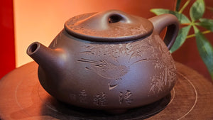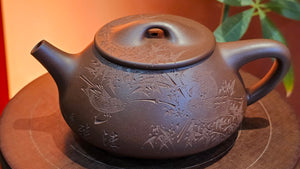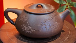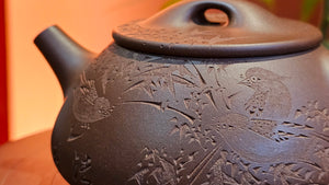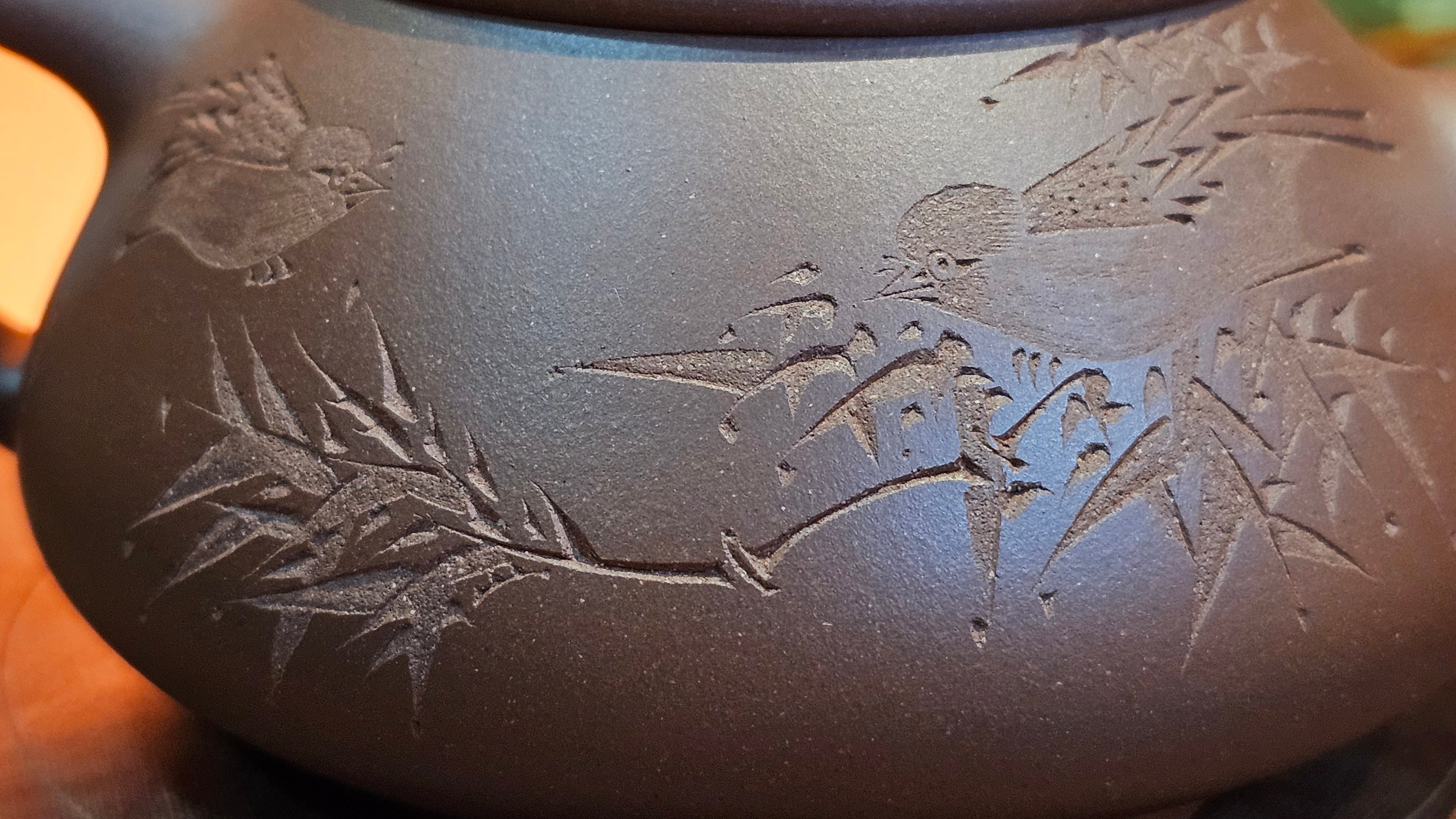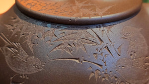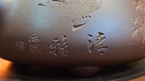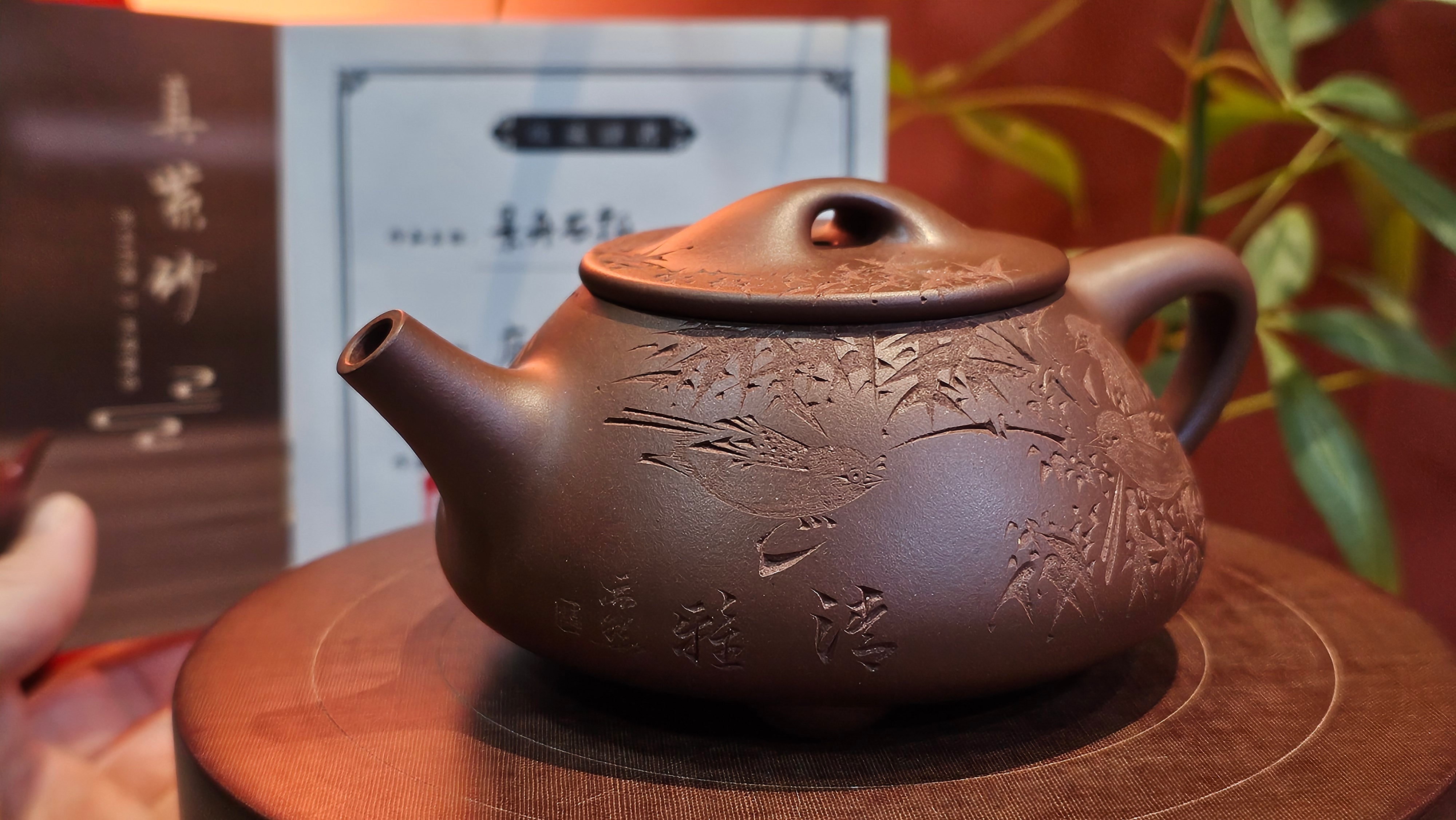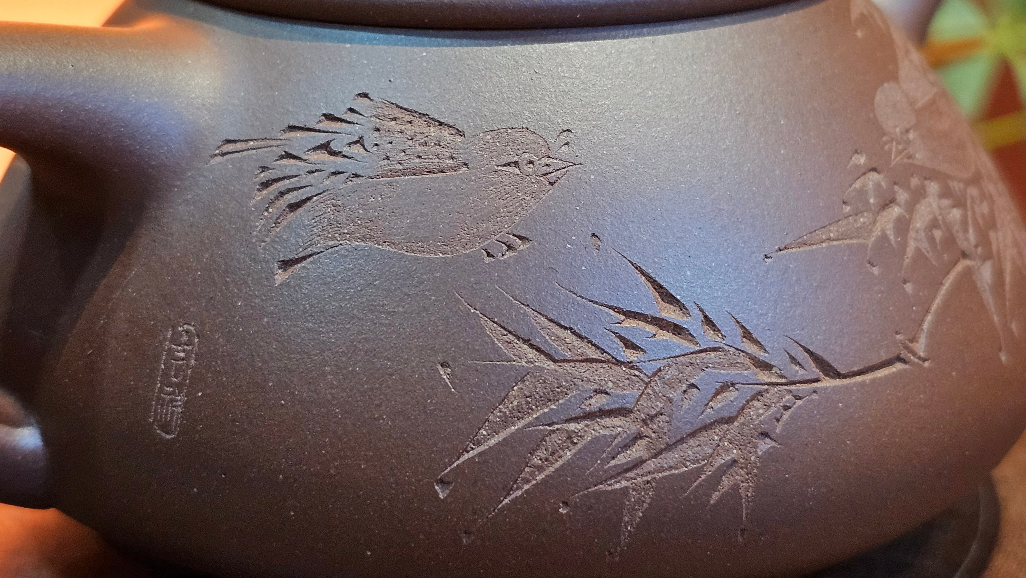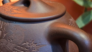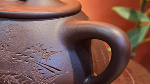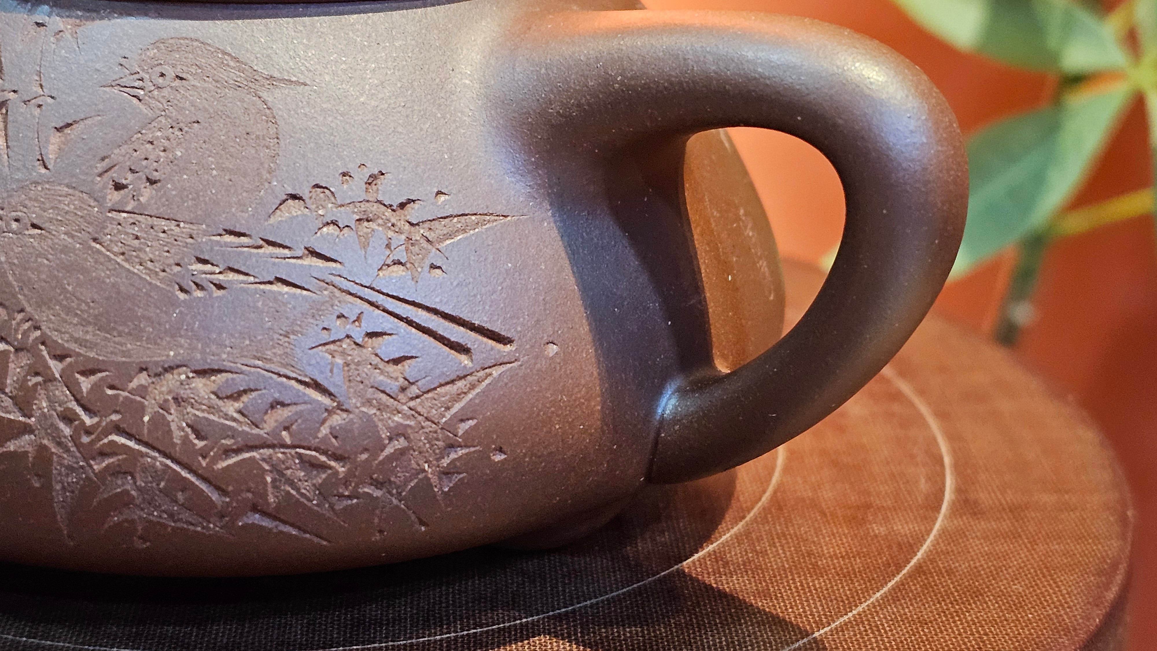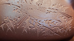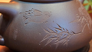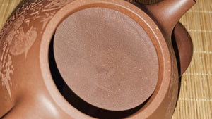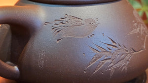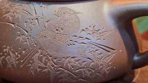 Jing Zhou Shi Piao 景舟石瓢 with exquisite! Robin Engraving 相思鸟刻绘, 271.3ml, DiCaoQing ZiNi 底槽青紫泥, by our Collaborative Craftsman Chen Fa Chu 陈法初 (pot) and Craftsman Yi Ran 亦然 (engraving)。