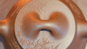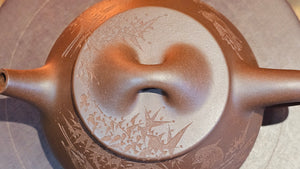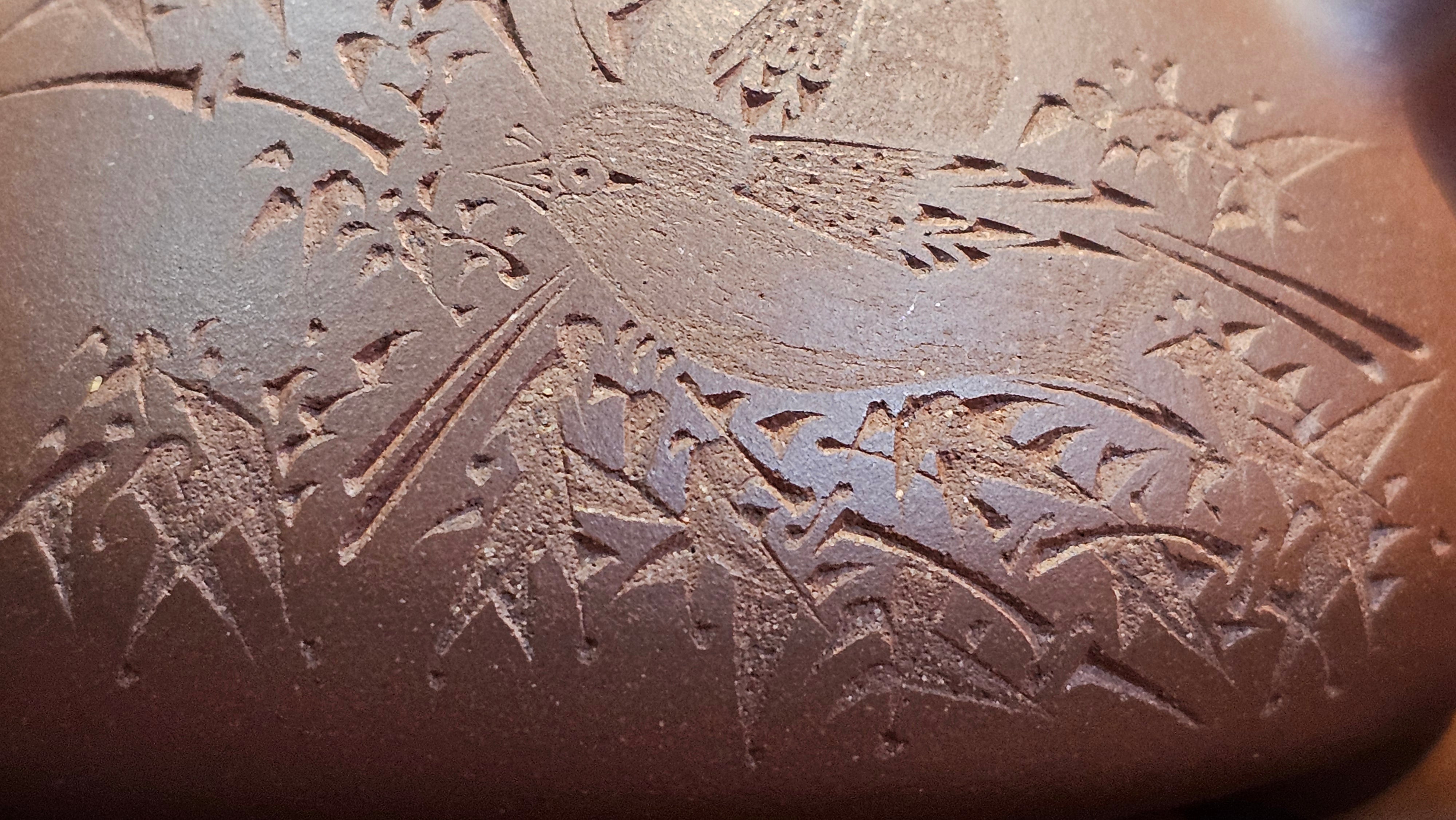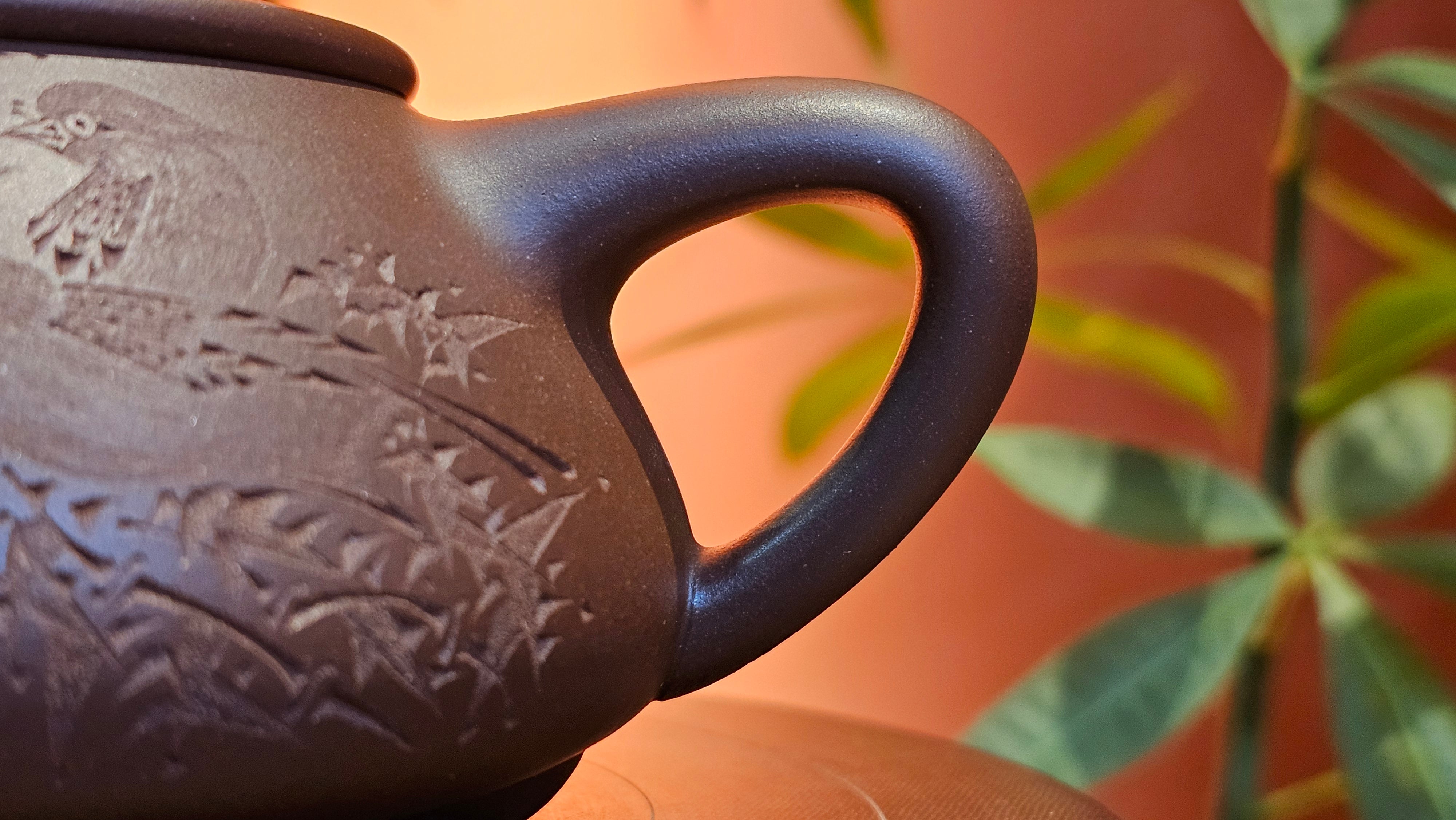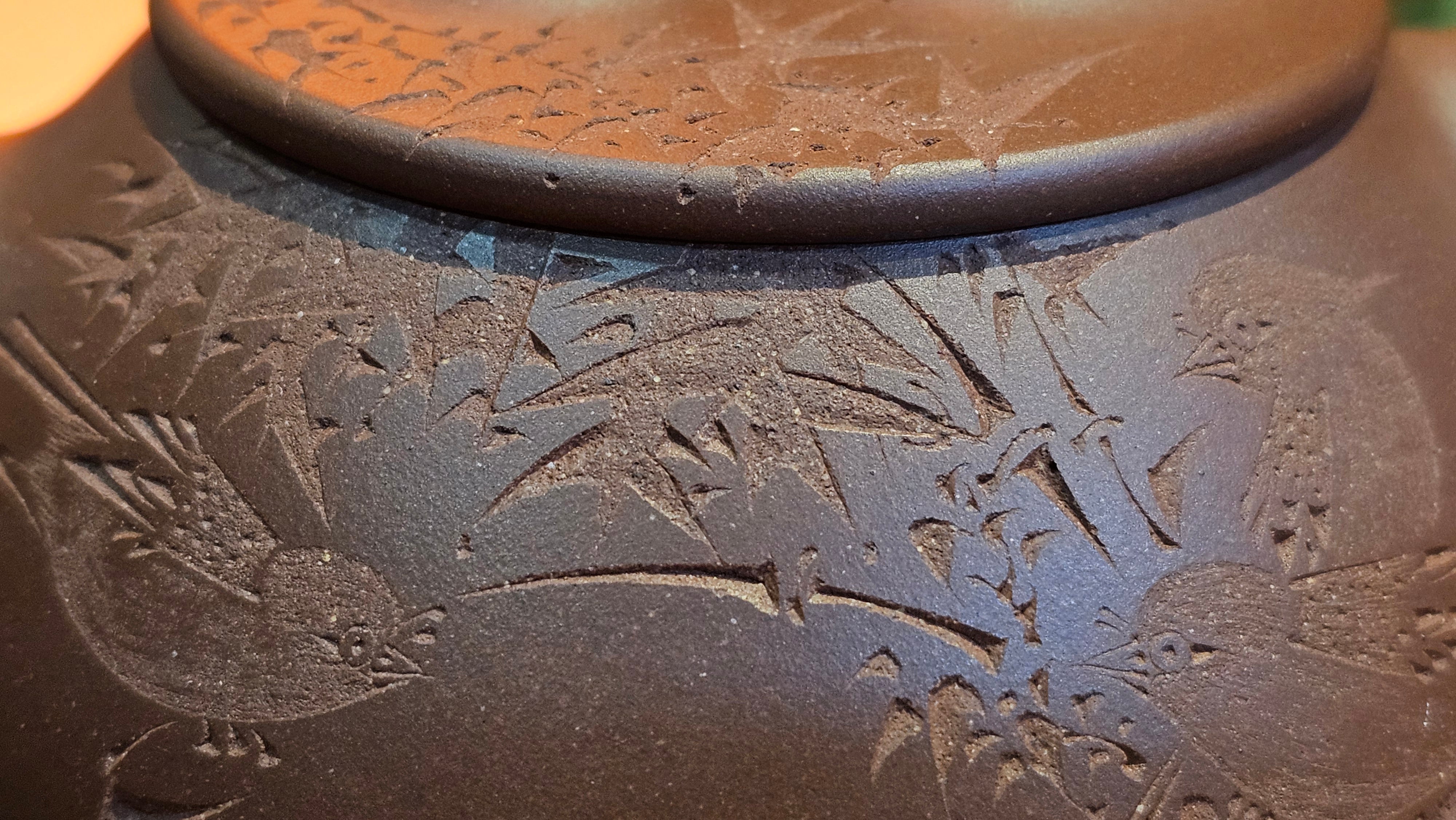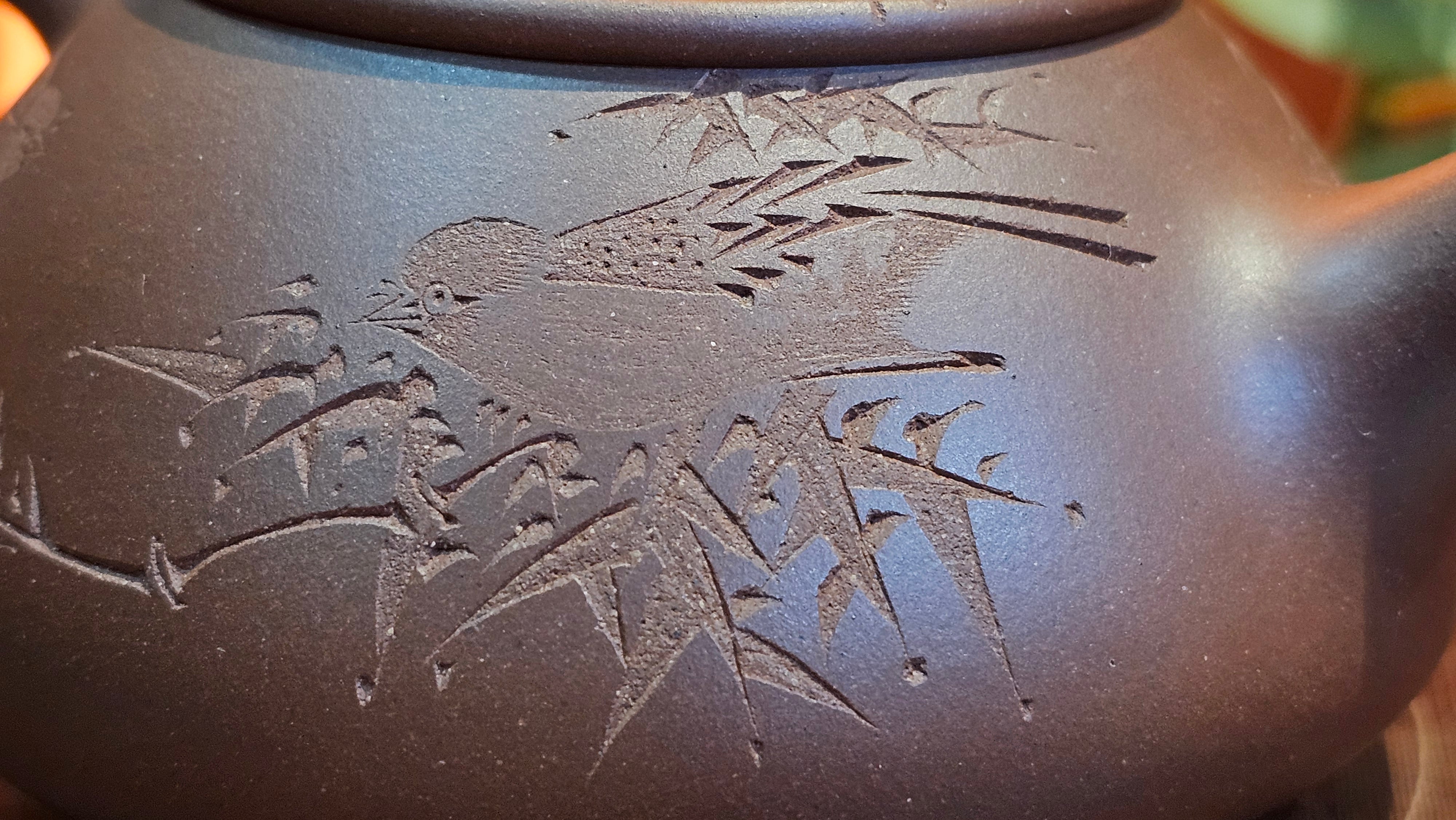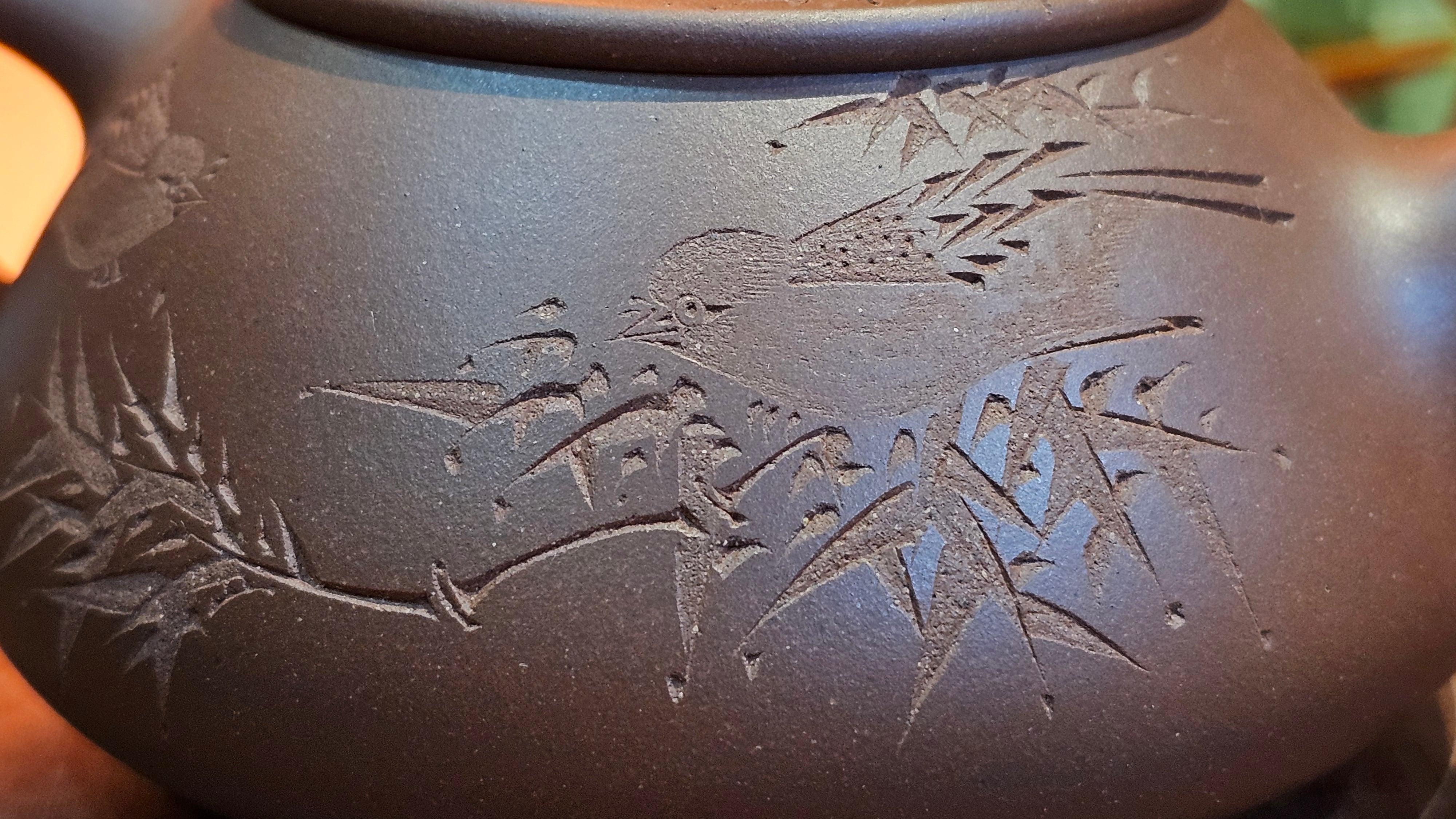 Jing Zhou Shi Piao 景舟石瓢 with exquisite! Robin Engraving 相思鸟刻绘, 271.3ml, DiCaoQing ZiNi 底槽青紫泥, by our Collaborative Craftsman Chen Fa Chu 陈法初 (pot) and Craftsman Yi Ran 亦然 (engraving)。