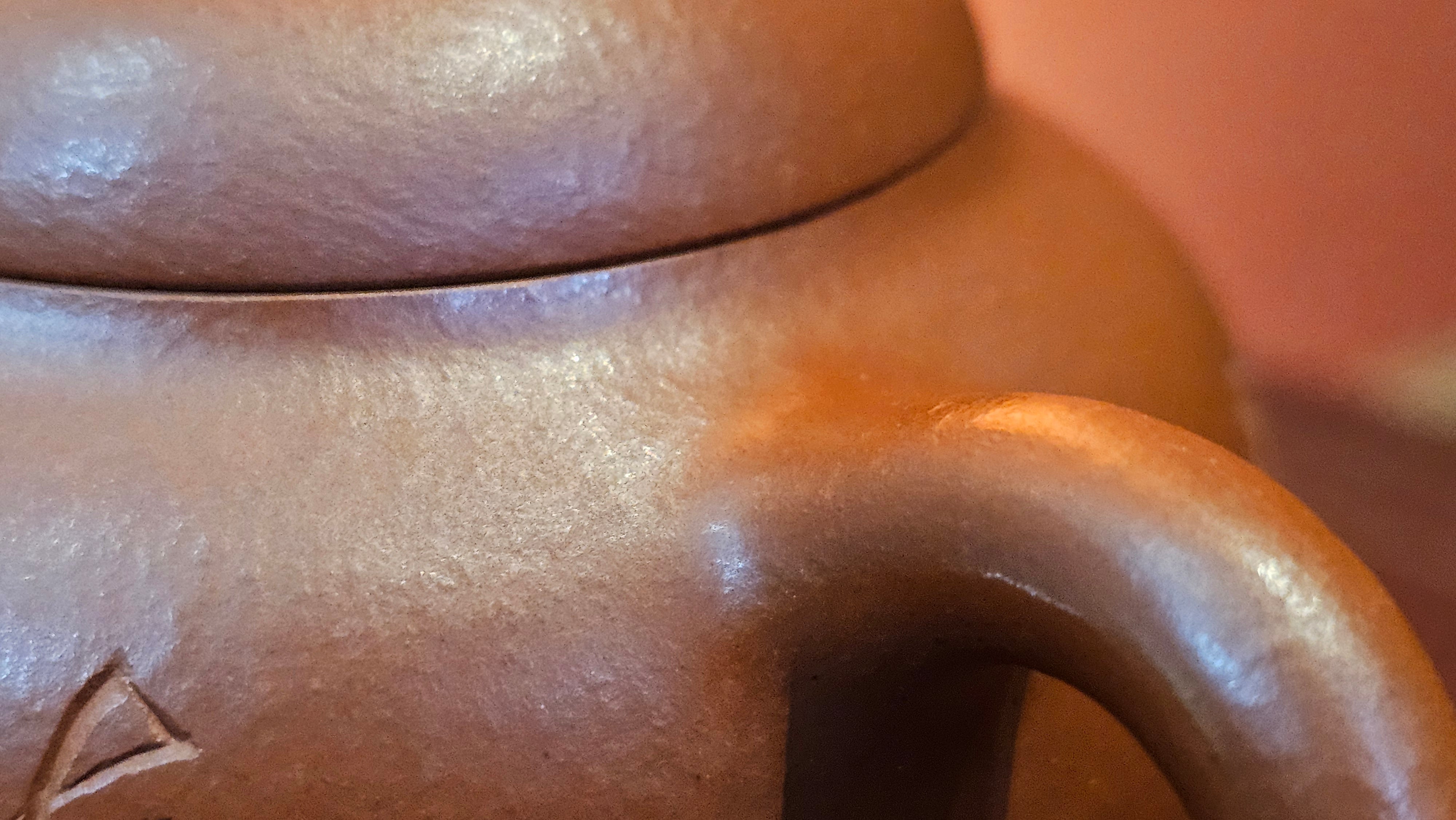 1) She carefully and consciously fashioned in an L-Shaped ventilation port out from the dome of the lid! The stalk of the fruit rises up and then joins with the slightly curved Crescent-Shaped Branch. How lovely! We also acknowledge the slimness in girth of the stalk when viewed axially. Thank you Craftsman Wang Hui!