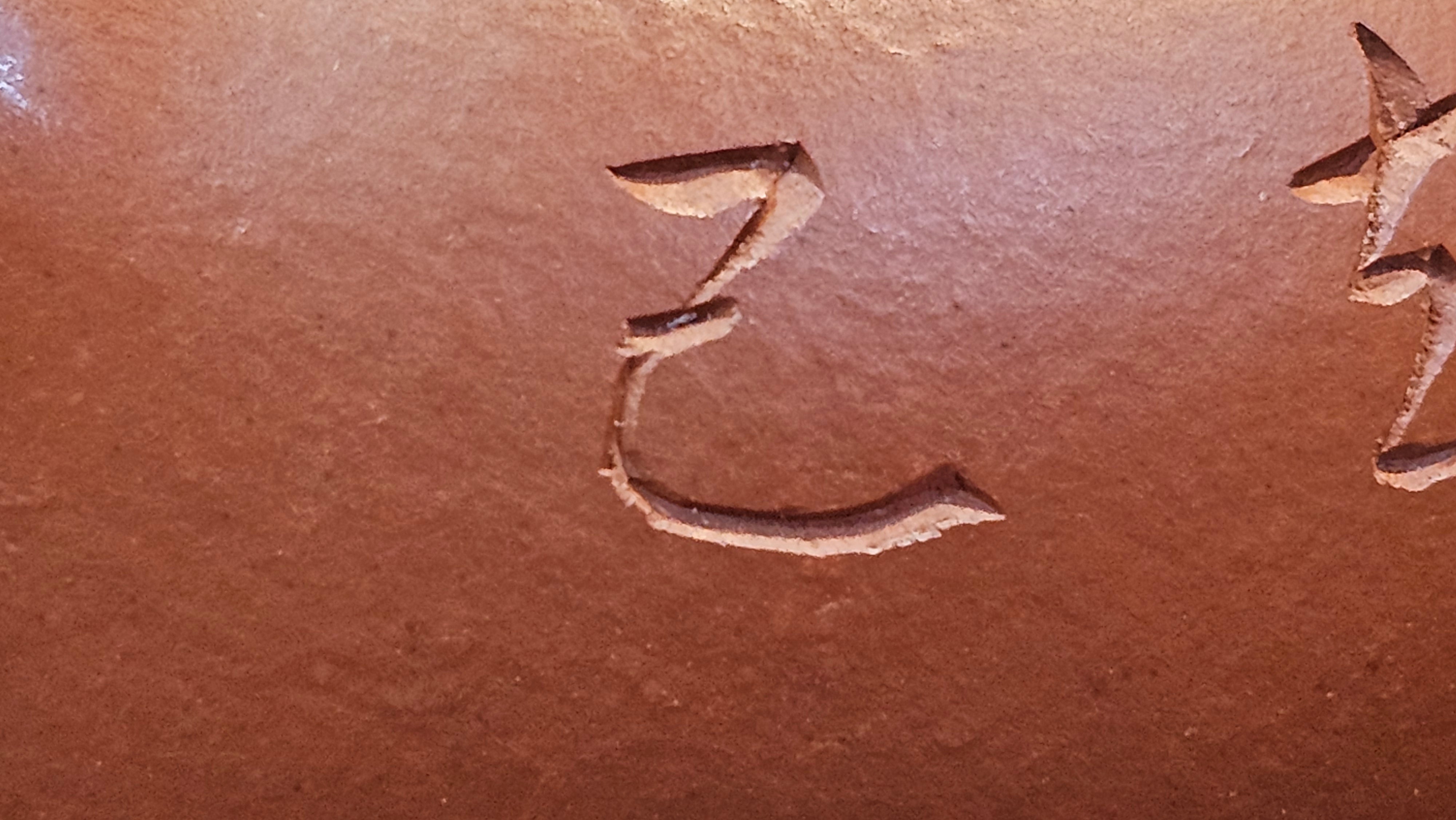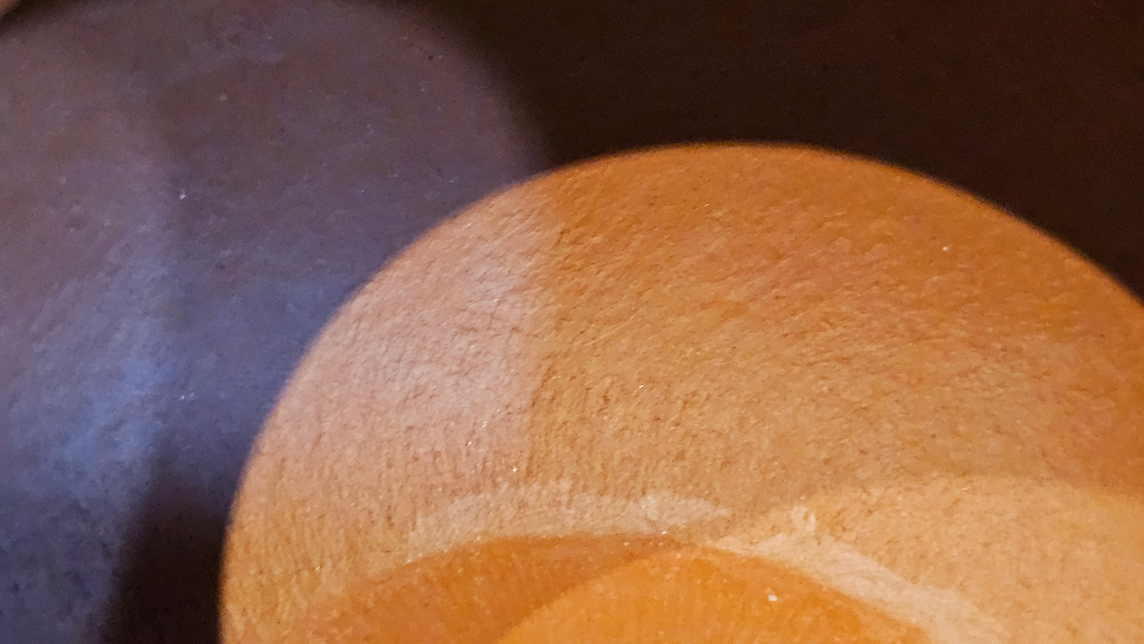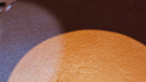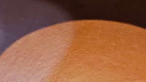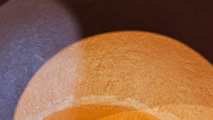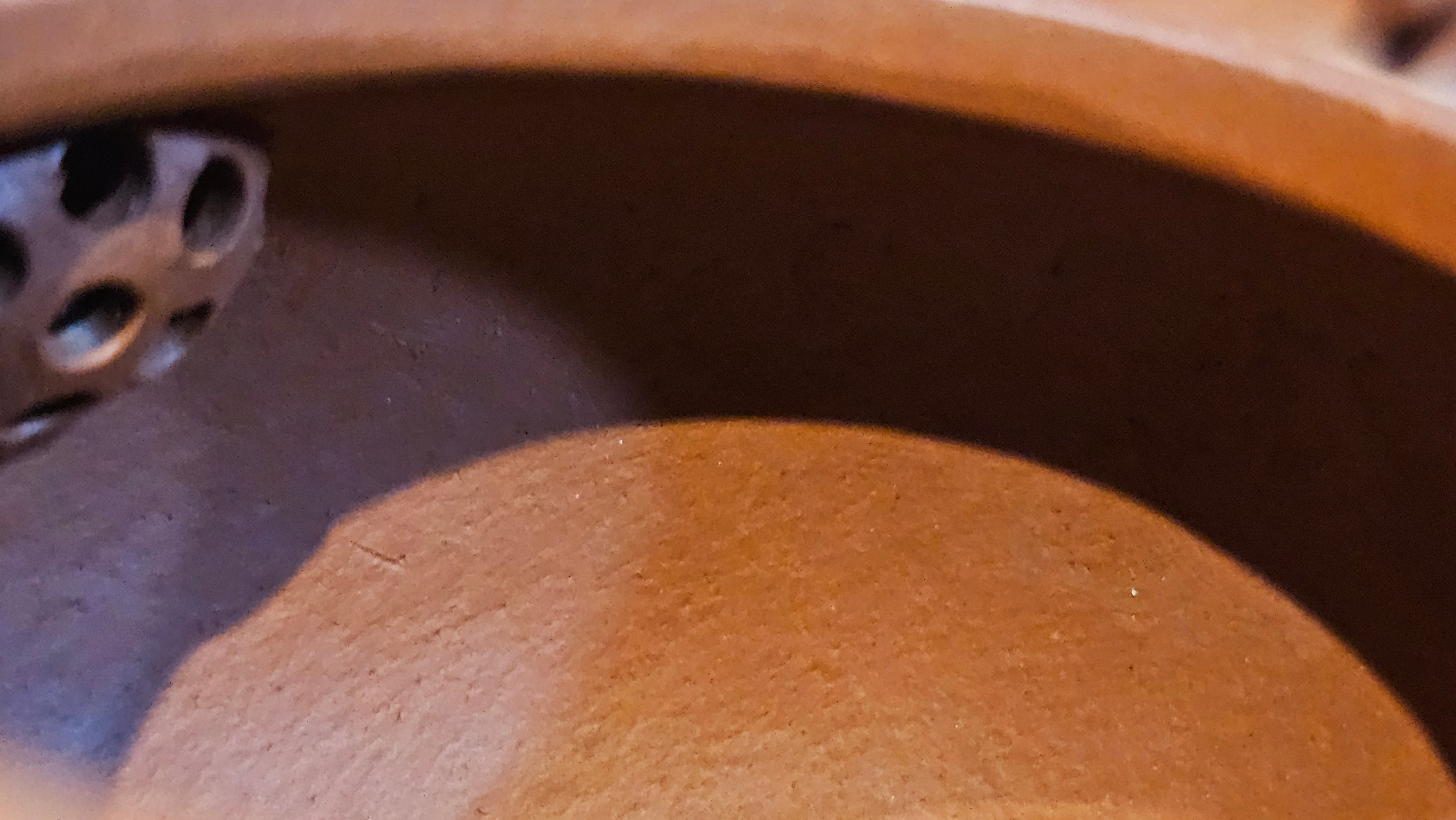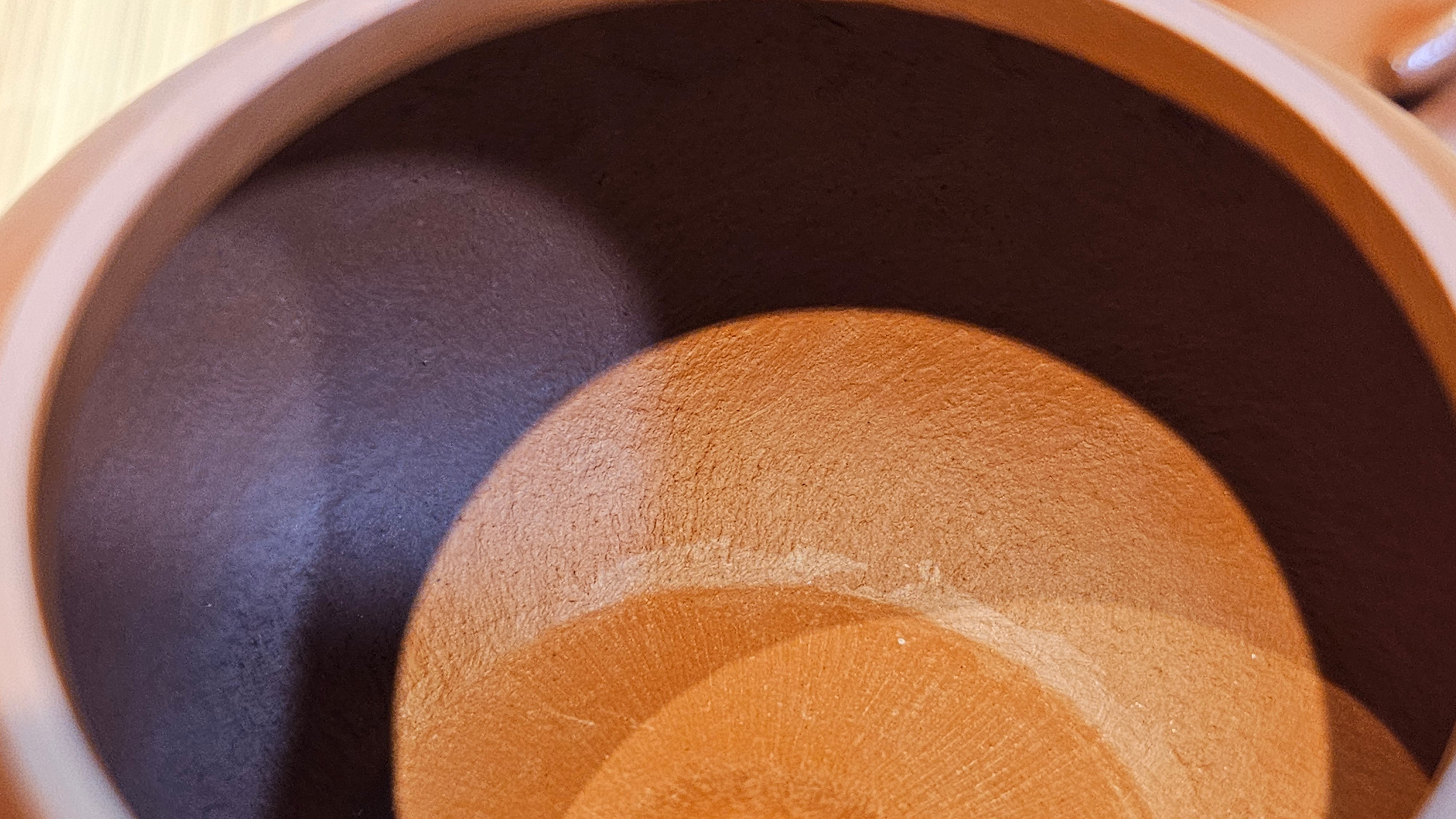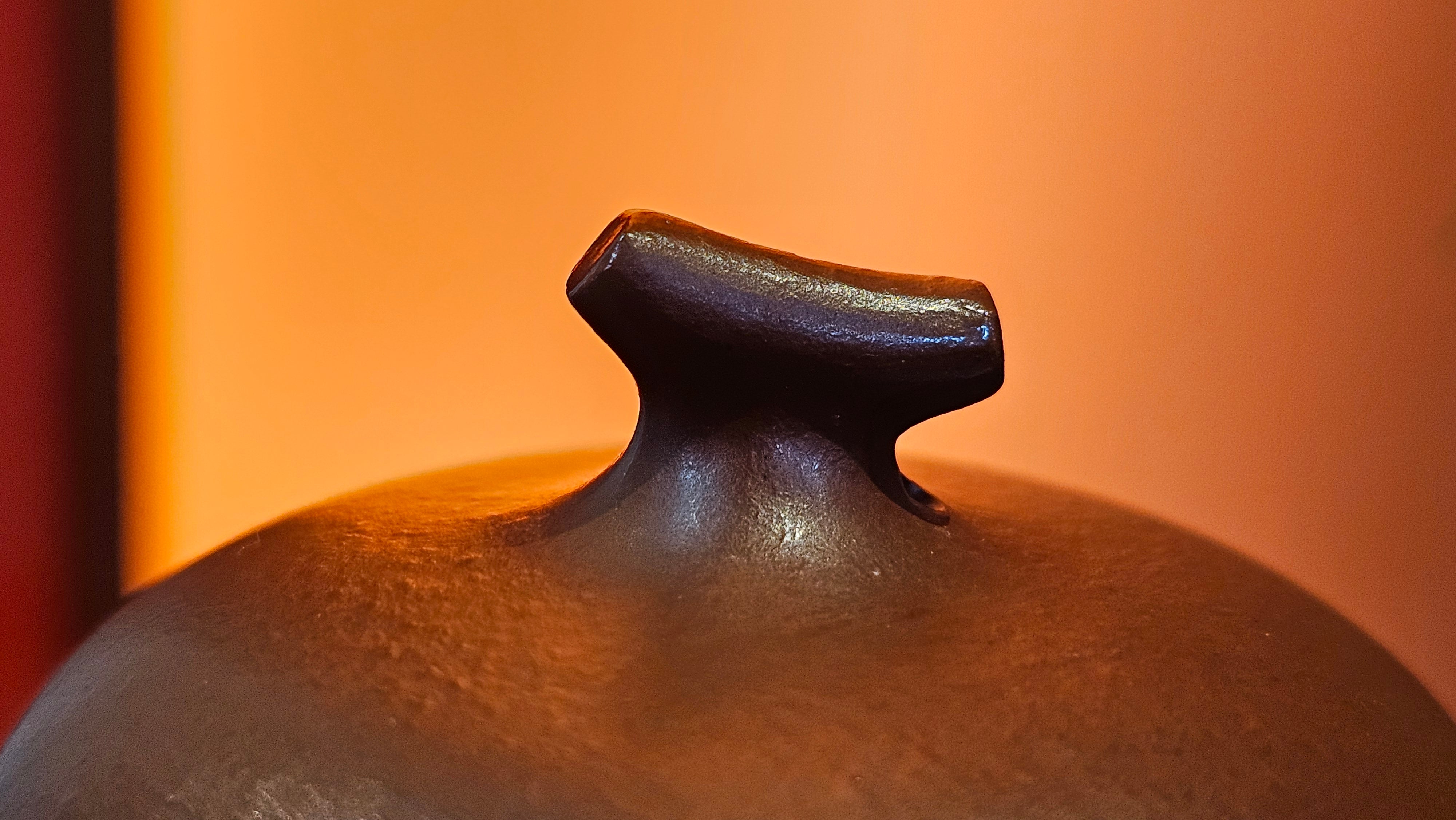 In the photos of the inner walls: you may see the faint finger pulp imprints on the upper aspect of the inner walls 360degrees all round. These are the imprints of the fingers of the Craftsman :-), as he/she places the finger(s) within as the he/she pats the paddle from the outside during the shaping of the main holding body.
