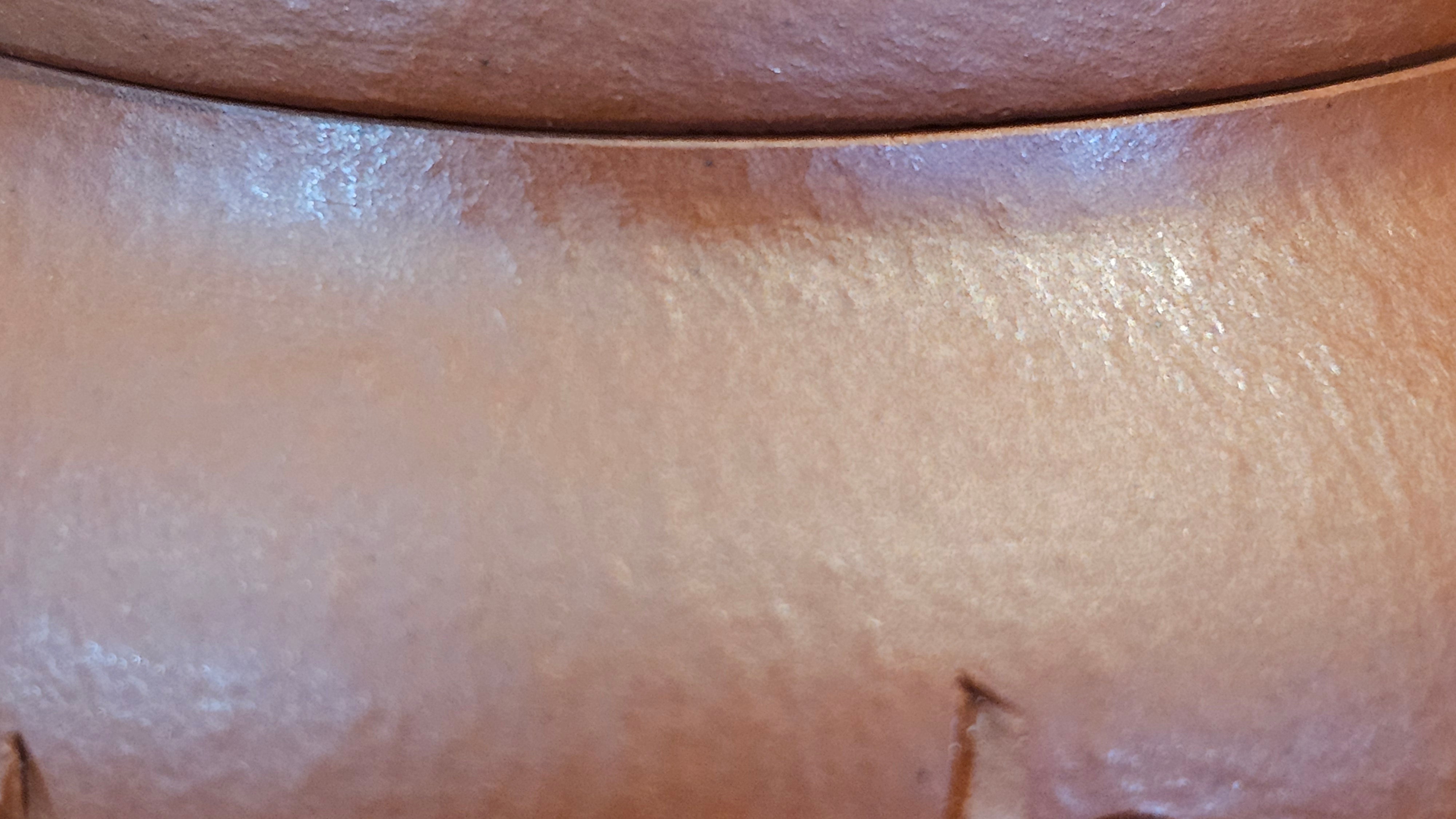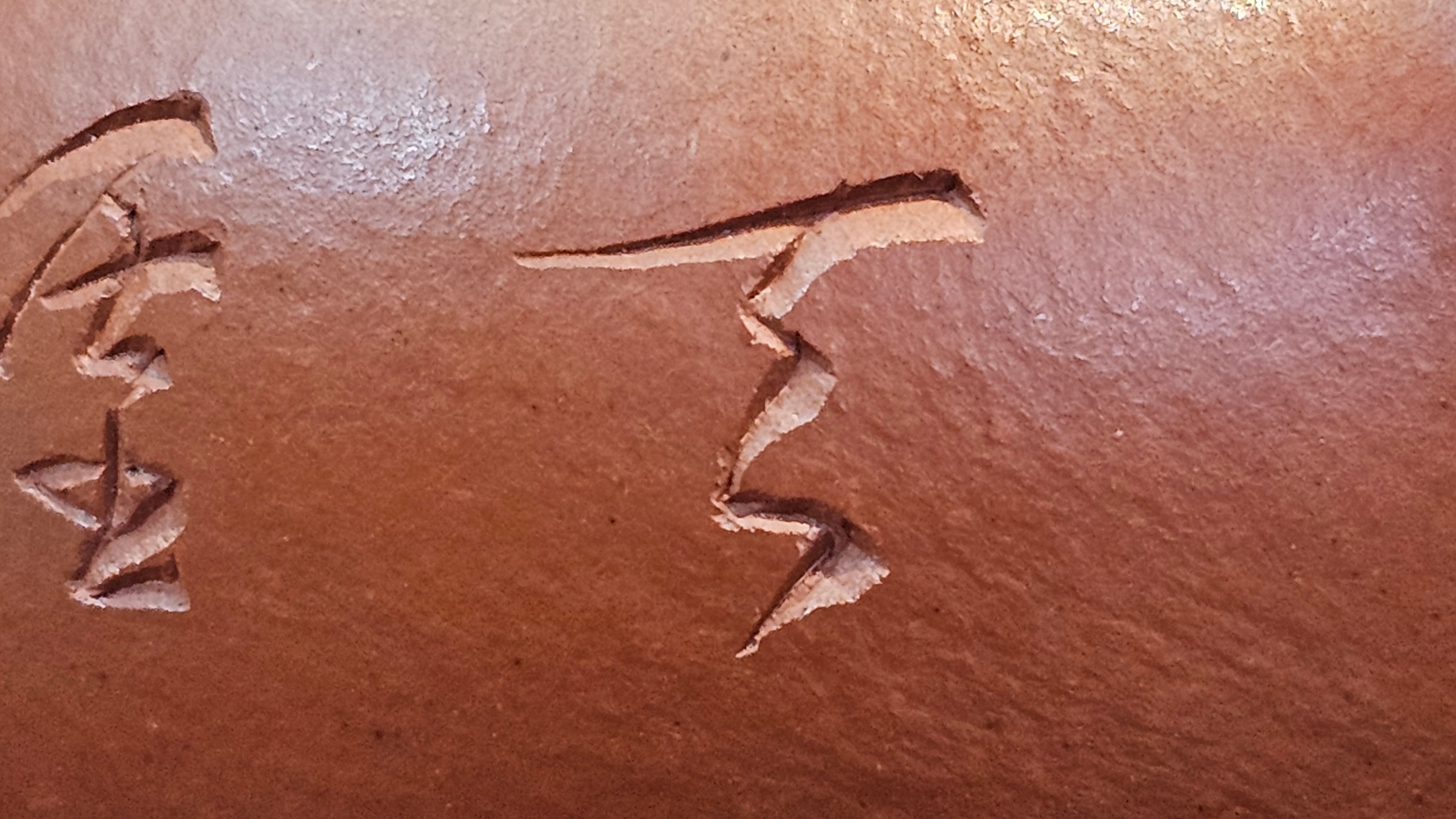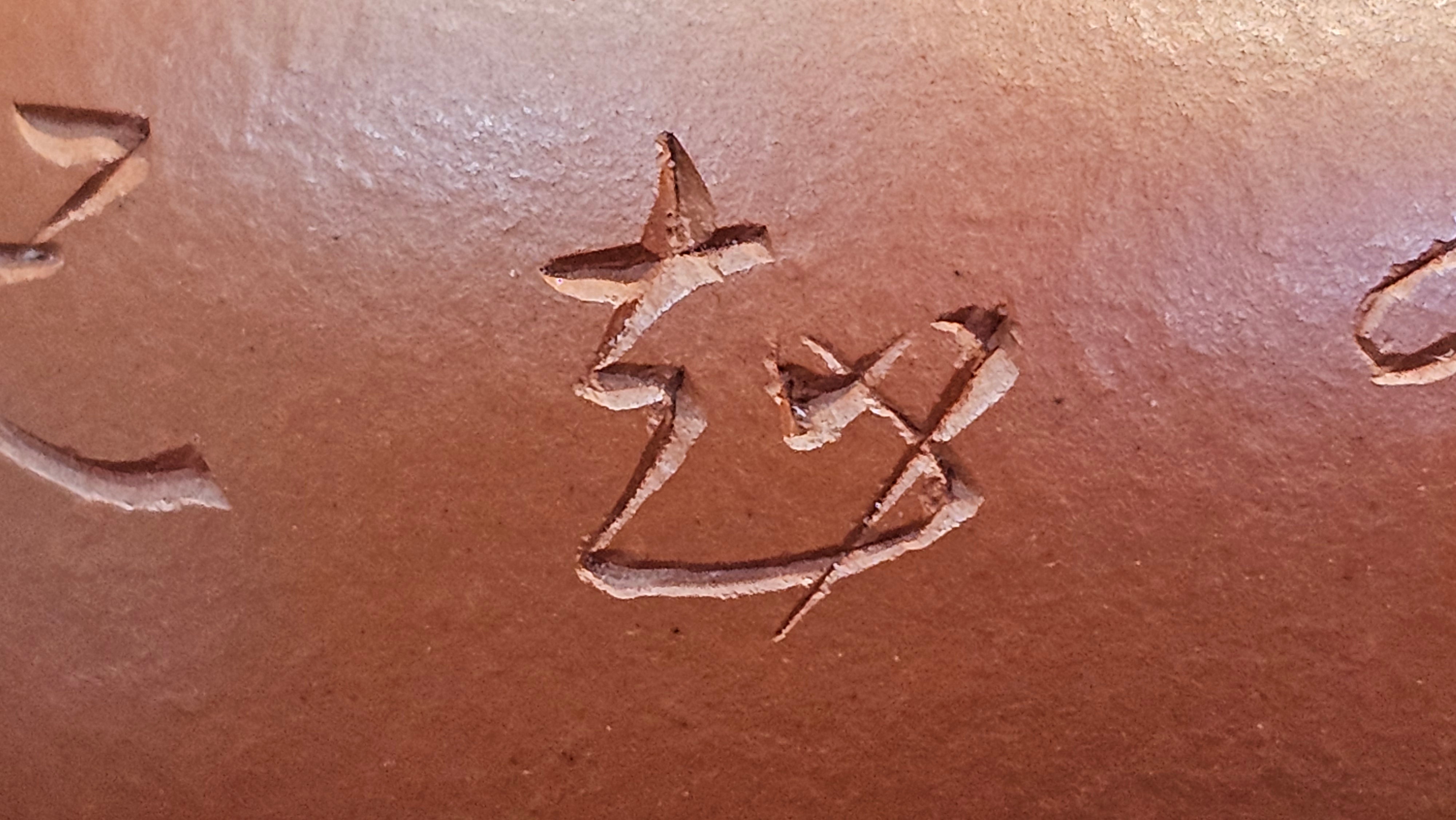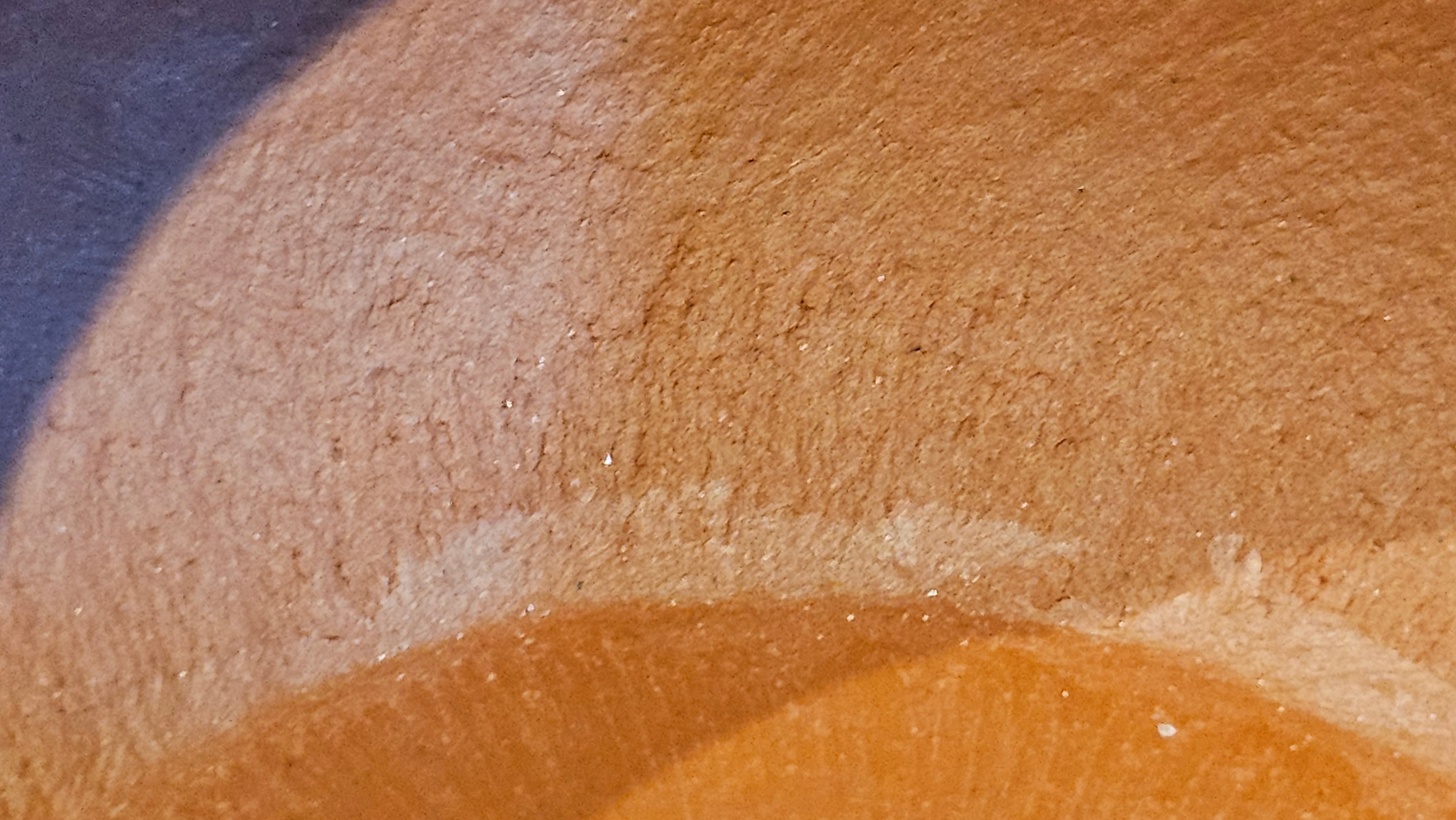 In the photos of the inner walls: you may see the faint finger pulp imprints on the upper aspect of the inner walls 360degrees all round. These are the imprints of the fingers of the Craftsman :-), as he/she places the finger(s) within as the he/she pats the paddle from the outside during the shaping of the main holding body.
