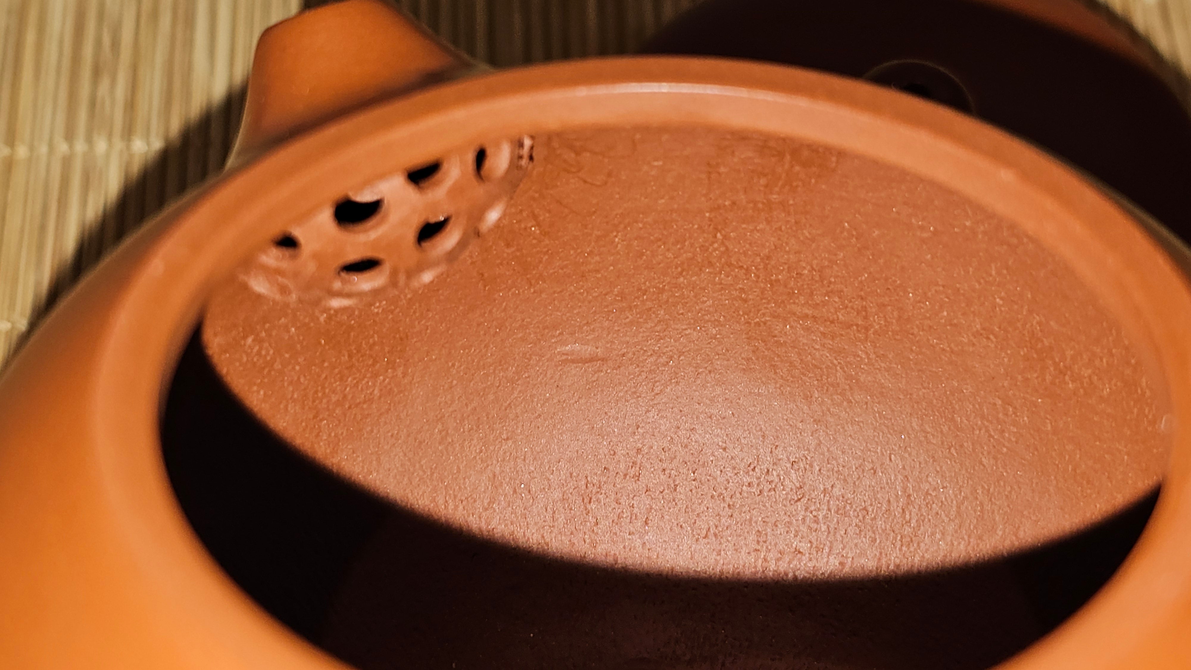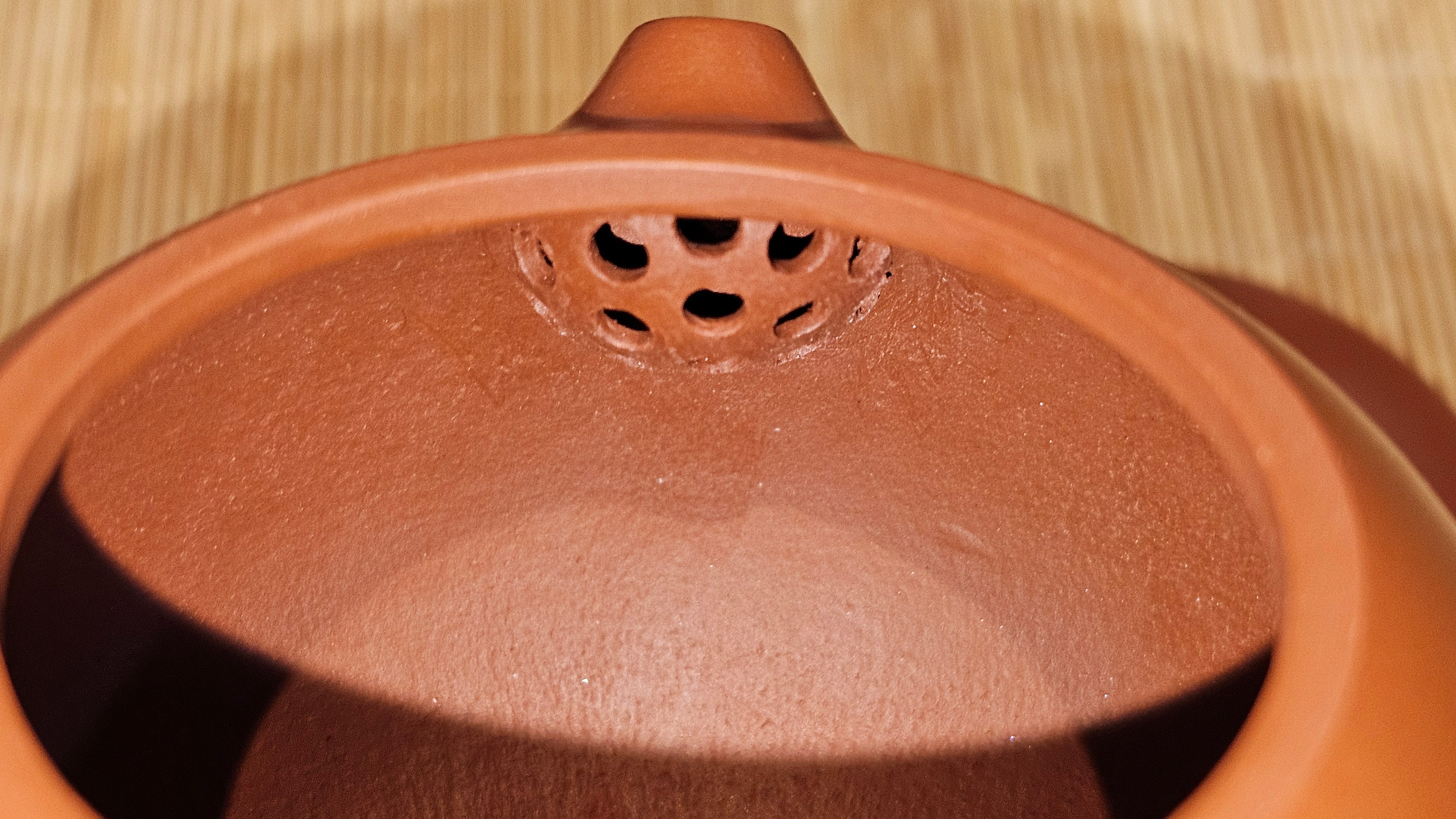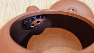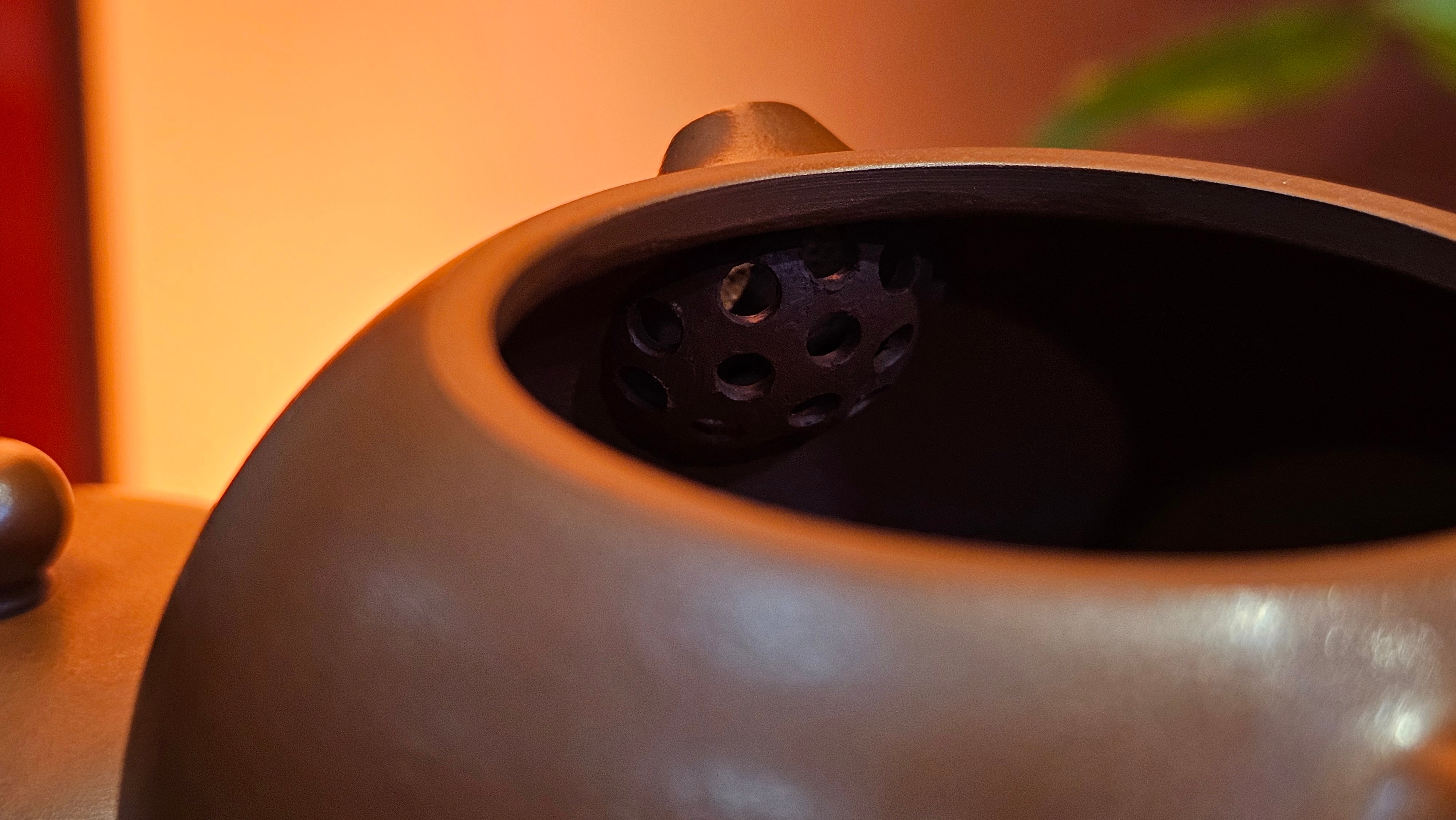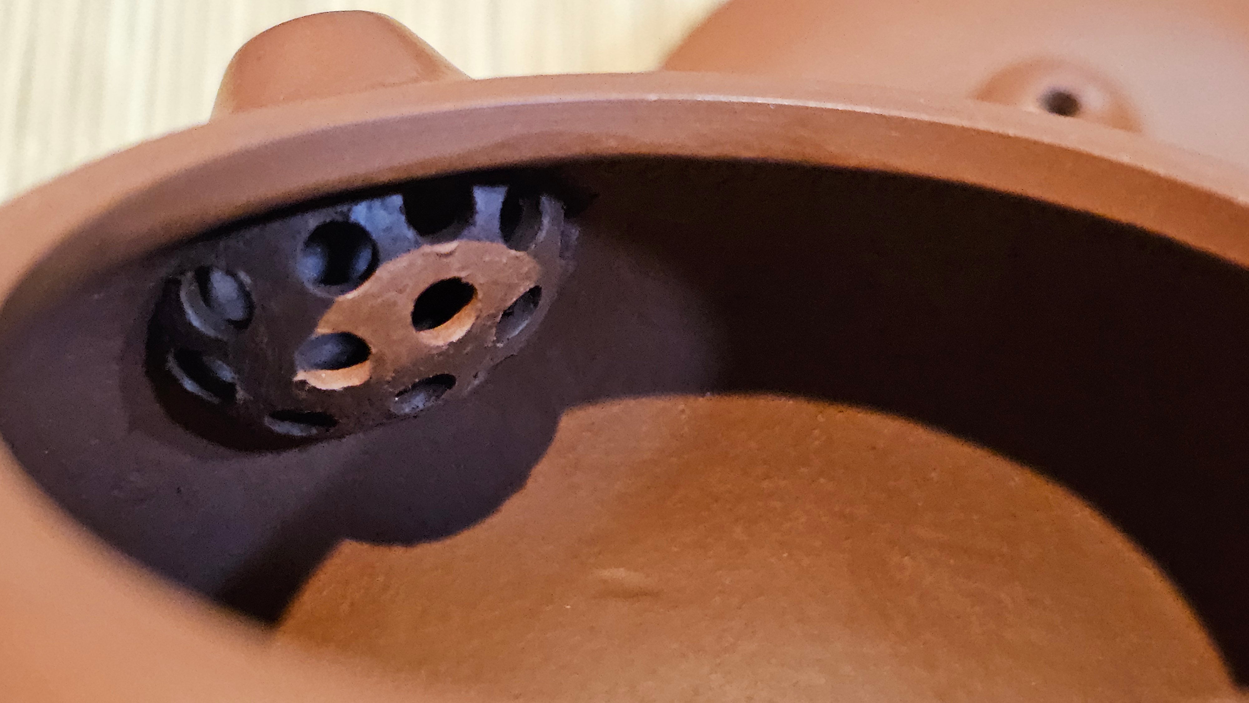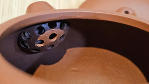 3.  Craftsman Zhai also conscientiously sculpted a 手推内球孔 Hand-Pushed Spherical Filter to increase the number of filter holes for a solid and fast pour of tea out, working with the largish diameter spout; and with better catching of tea leaves at the bottom fast while allowing tea to flow out from the upper holes.