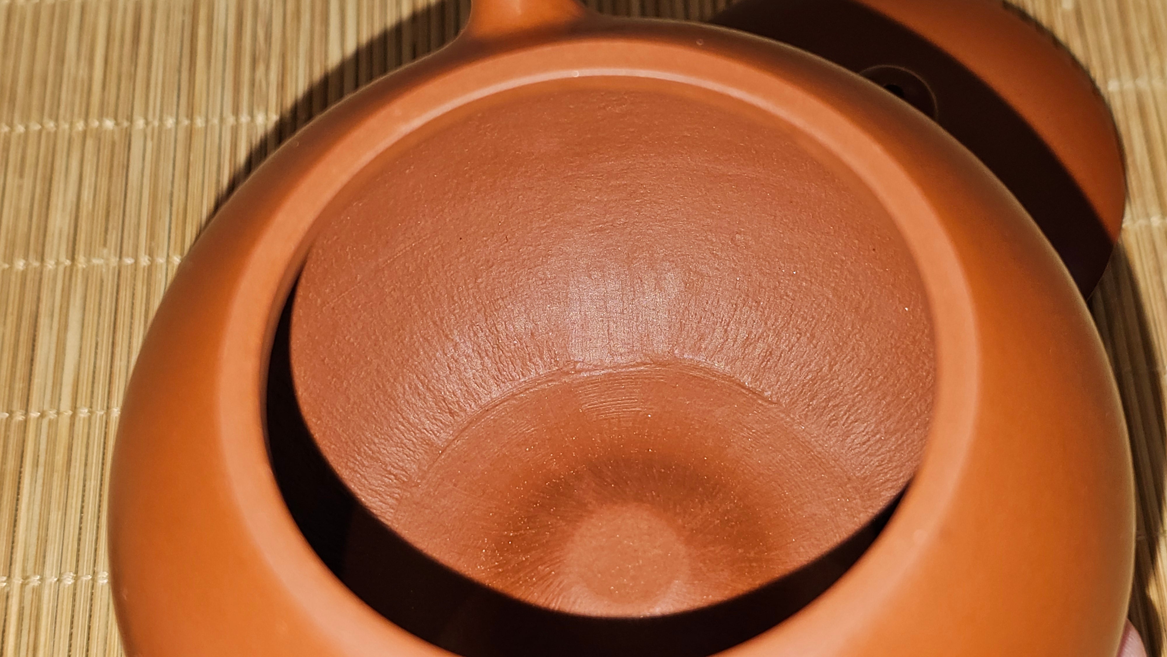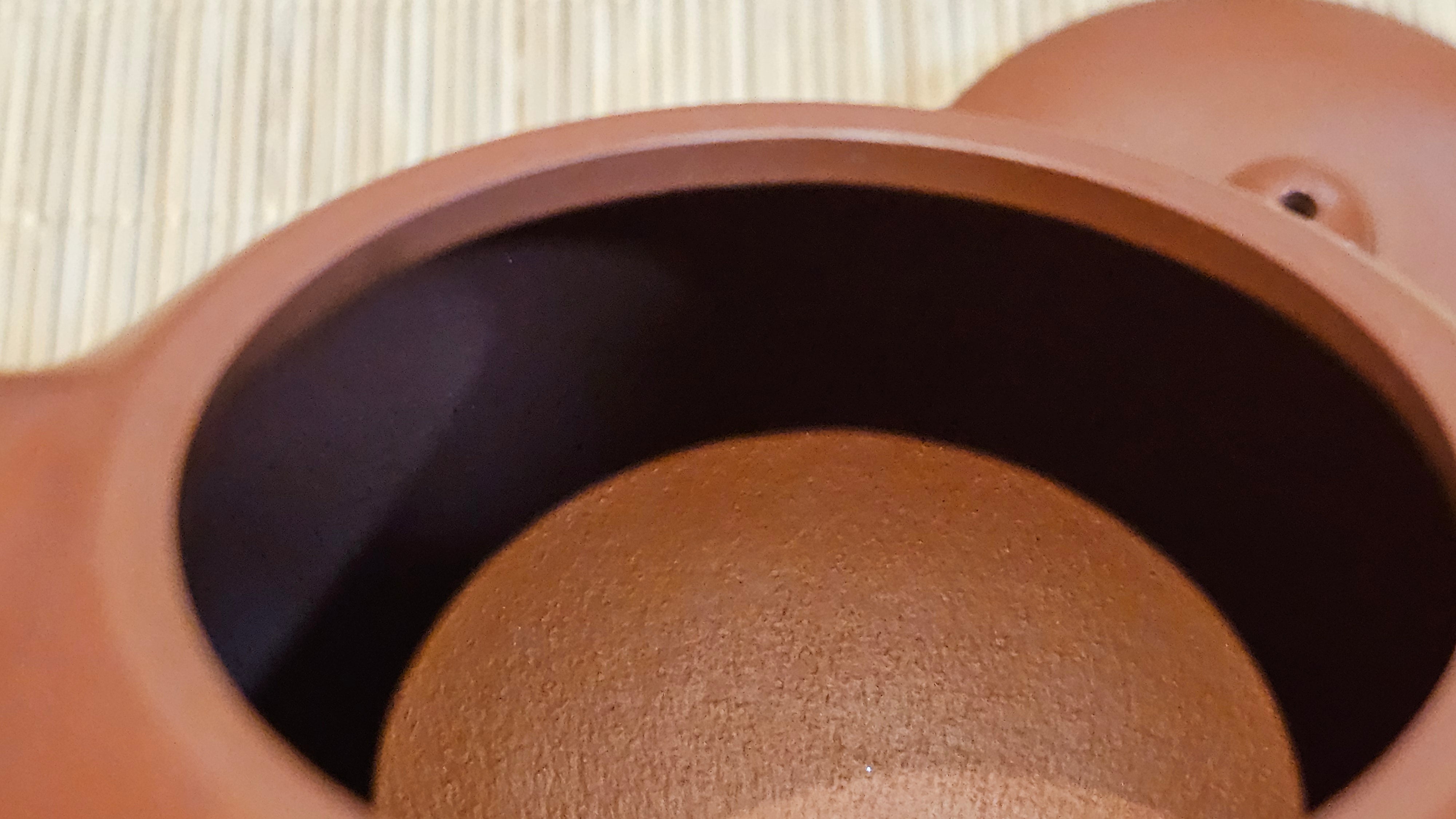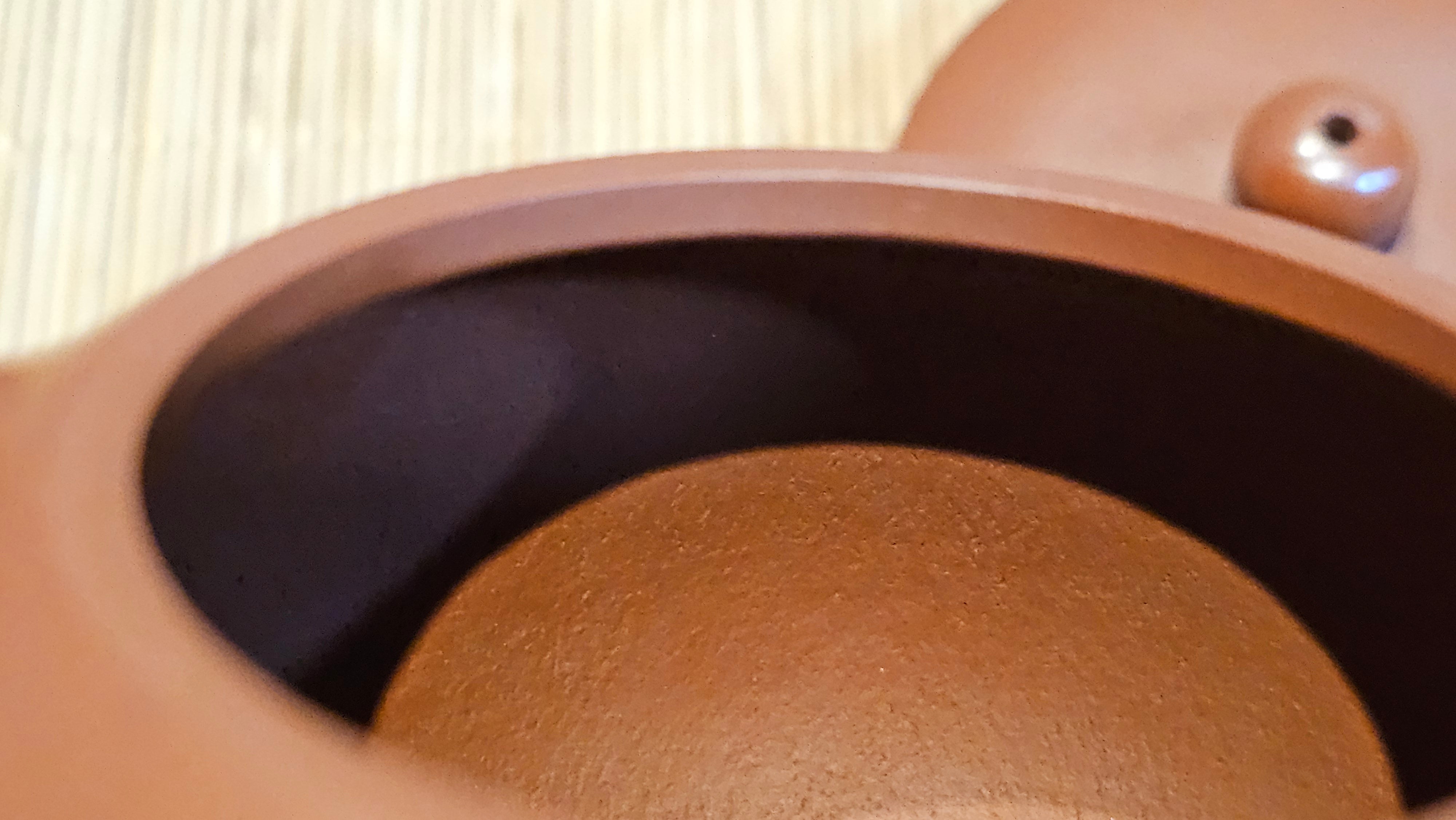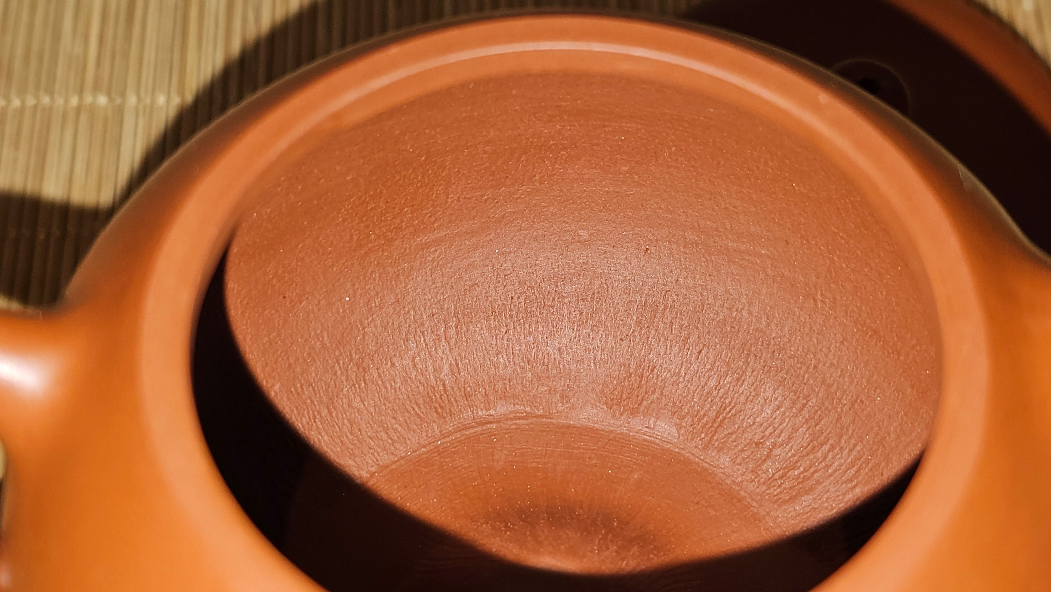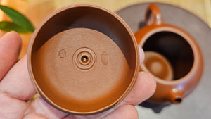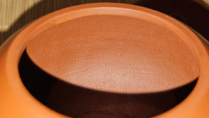 Also to be cherished and witnessed in this ZiSha Work, you : besides the usual important, critical and beautiful hallmarks of a Fully-Handmade ZiSha pot, this pot has the discontinuous and roughly horizontal marks evident on the inner walls, and these are called the: 泥凳纹 Ni Deng Wen, which are the marks left on the clay slab, complementary to the marks on the workbench of the Craftsman Zhang Wang Xing; During the making of FHM ZiSha pots, the Craftsmen will be using tools to cut the clay slabs, etc, and these cutting strokes will leave marks on the studio workbench.  Especially the first major forceful cut across the table to delineate the clay she/he wants to utilize to form the main body of the body.  Thus when the craftsman subsequently pound the clay slab on the workbench, these marks will be etched onto the clay slab.  Thus you are "enjoying" the additional natural hallmarks of a Fully-Handmade pot.  Even a partially handmade pot will not show these marks.  And those fake, those Jigger-machined pots may show CONCENTRIC continuous circular lines, usually all parallel to one another, and extremely uniform.
