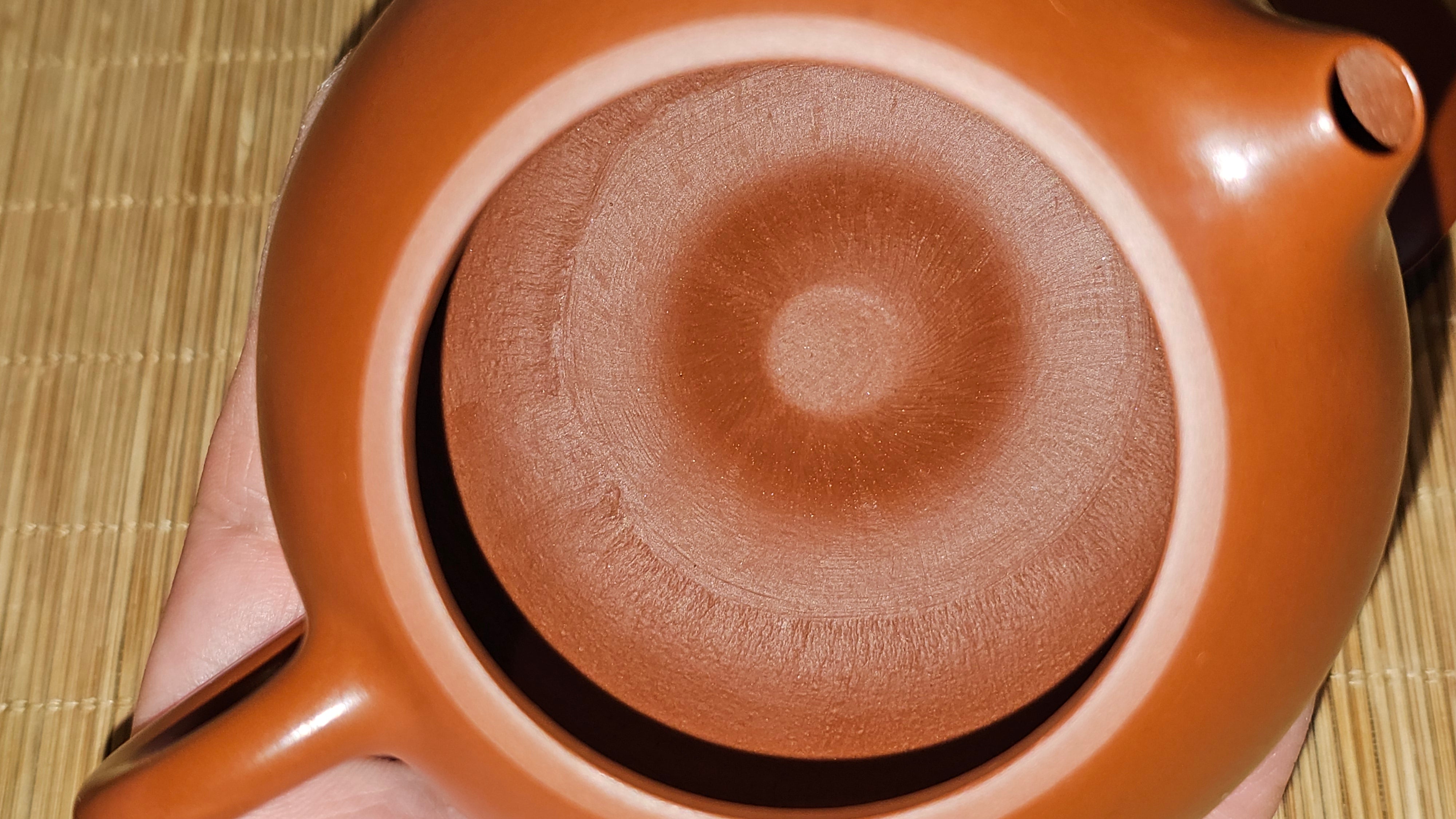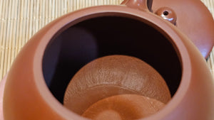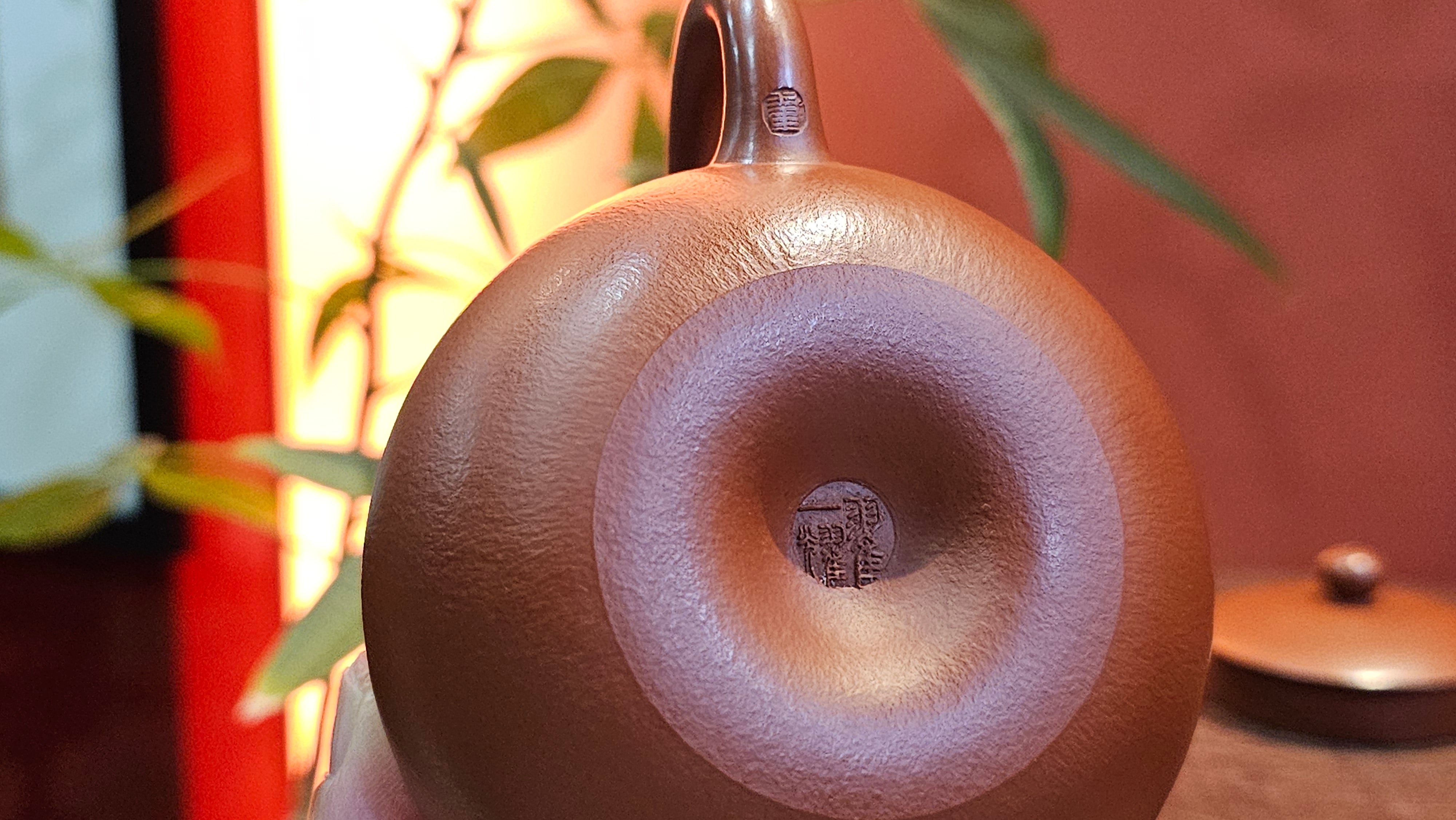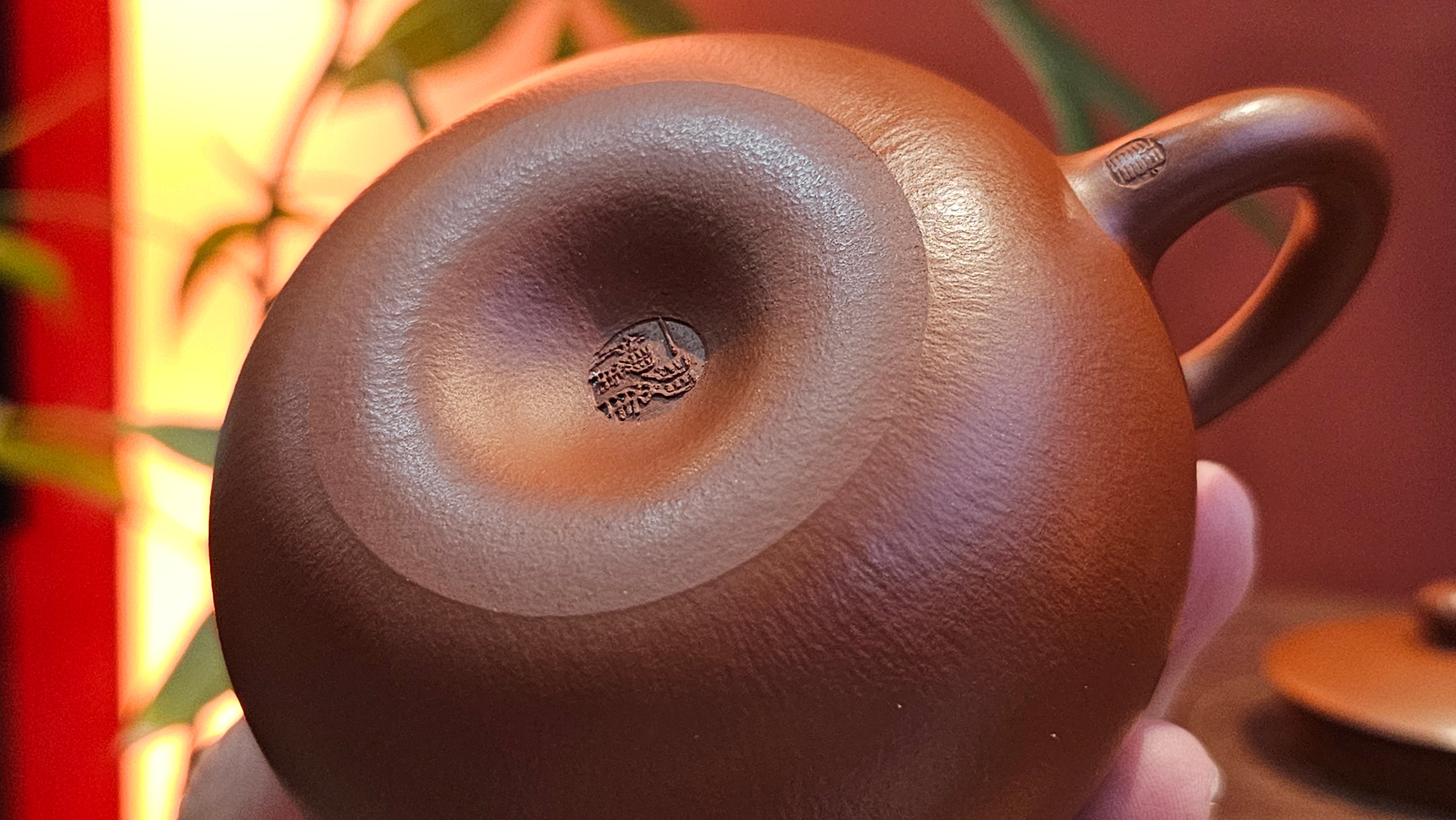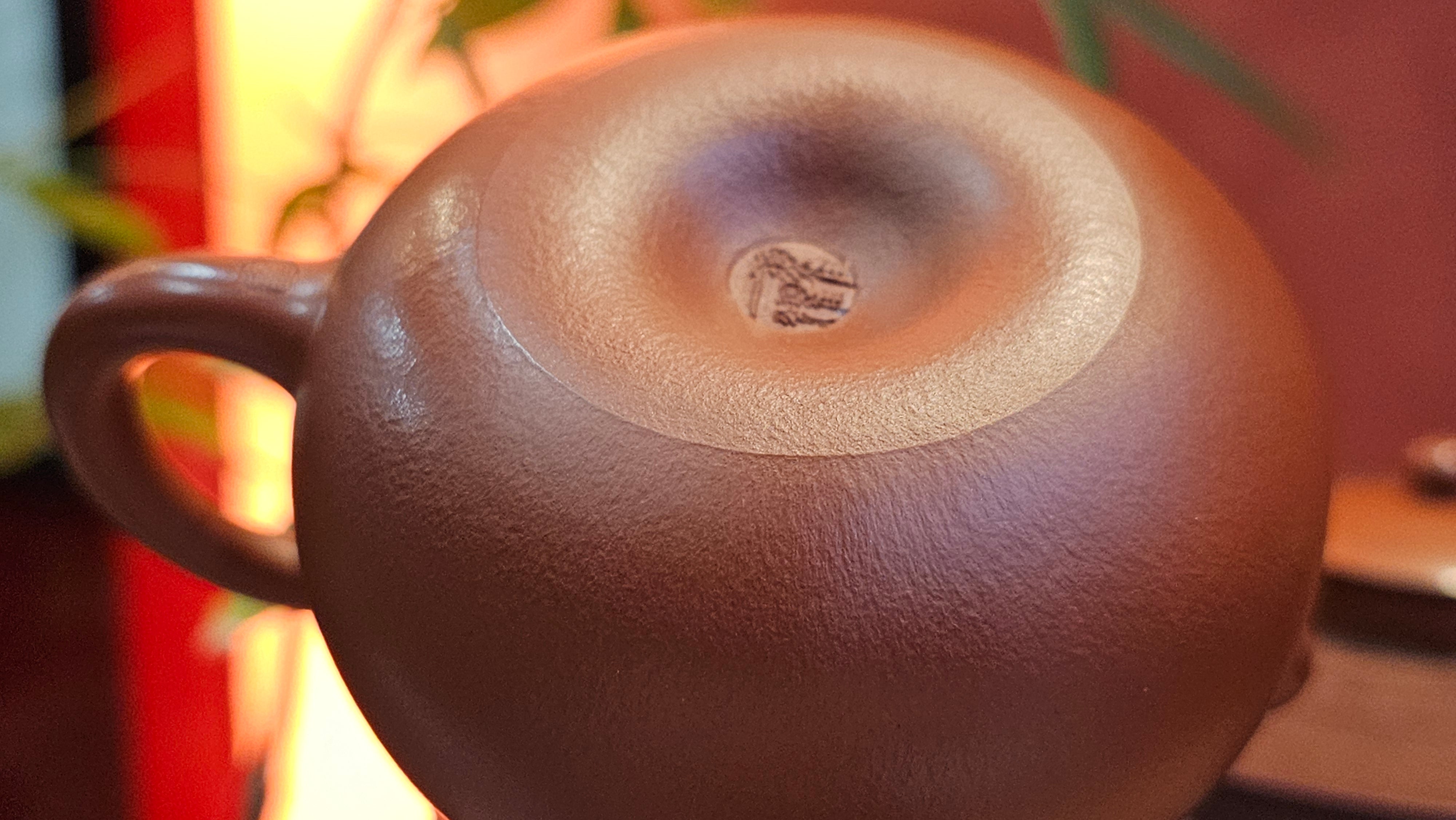 Also to be cherished and witnessed in this ZiSha Work, you : besides the usual important, critical and beautiful hallmarks of a Fully-Handmade ZiSha pot, this pot has the discontinuous and roughly horizontal marks evident on the inner walls, and these are called the: 泥凳纹 Ni Deng Wen, which are the marks left on the clay slab, complementary to the marks on the workbench of the Craftsman Zhang Wang Xing; During the making of FHM ZiSha pots, the Craftsmen will be using tools to cut the clay slabs, etc, and these cutting strokes will leave marks on the studio workbench.  Especially the first major forceful cut across the table to delineate the clay she/he wants to utilize to form the main body of the body.  Thus when the craftsman subsequently pound the clay slab on the workbench, these marks will be etched onto the clay slab.  Thus you are "enjoying" the additional natural hallmarks of a Fully-Handmade pot.  Even a partially handmade pot will not show these marks.  And those fake, those Jigger-machined pots may show CONCENTRIC continuous circular lines, usually all parallel to one another, and extremely uniform.