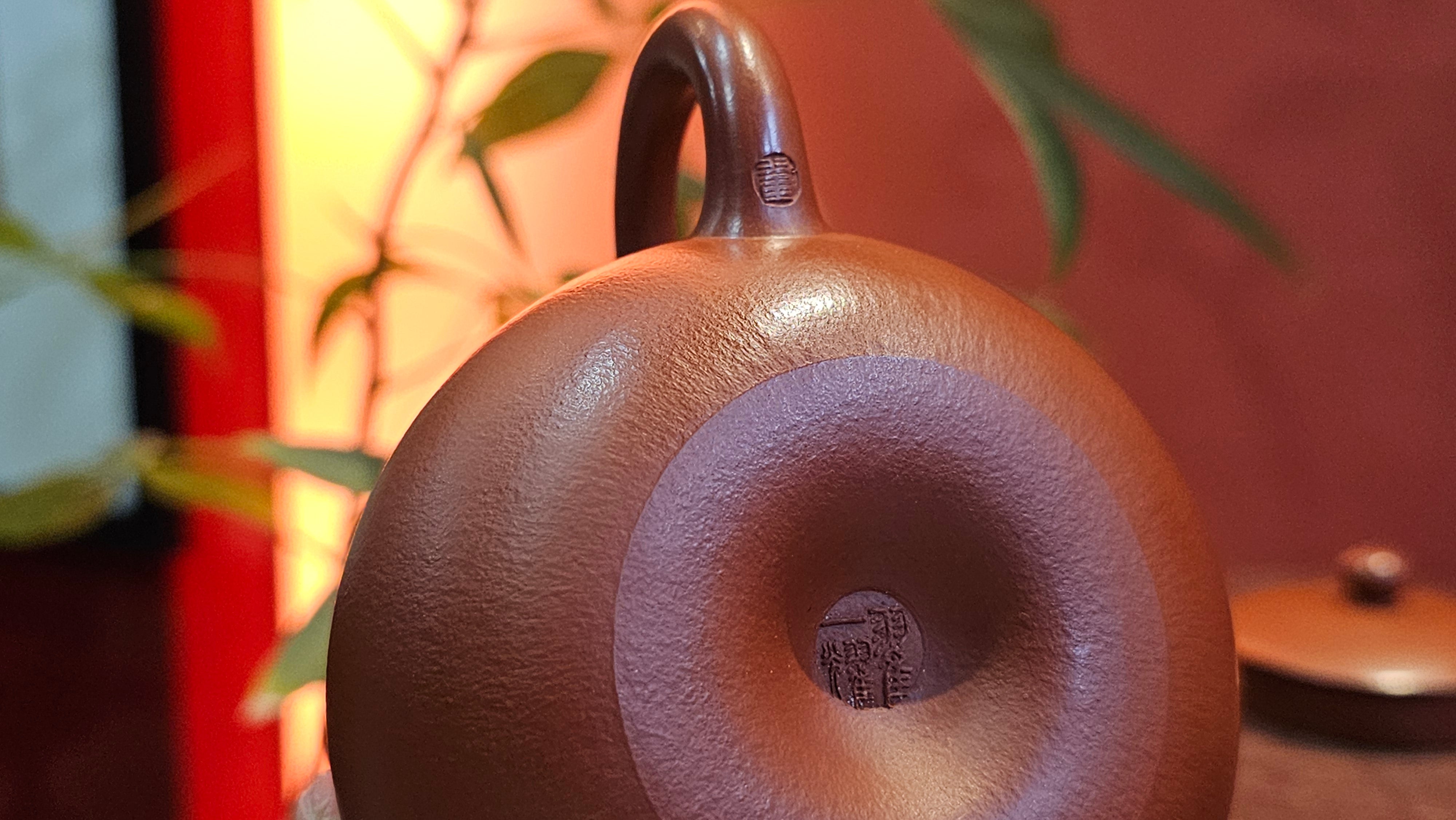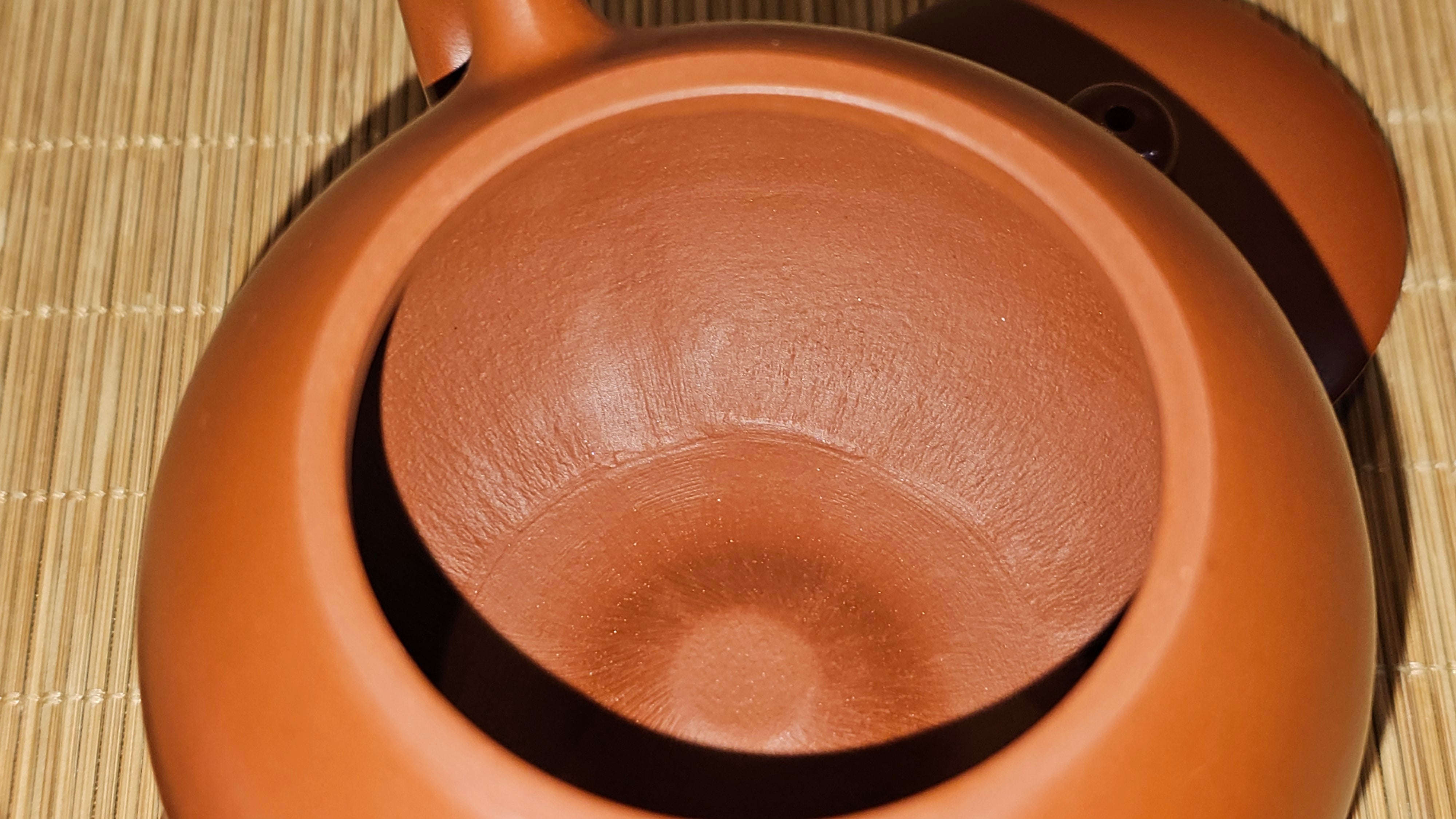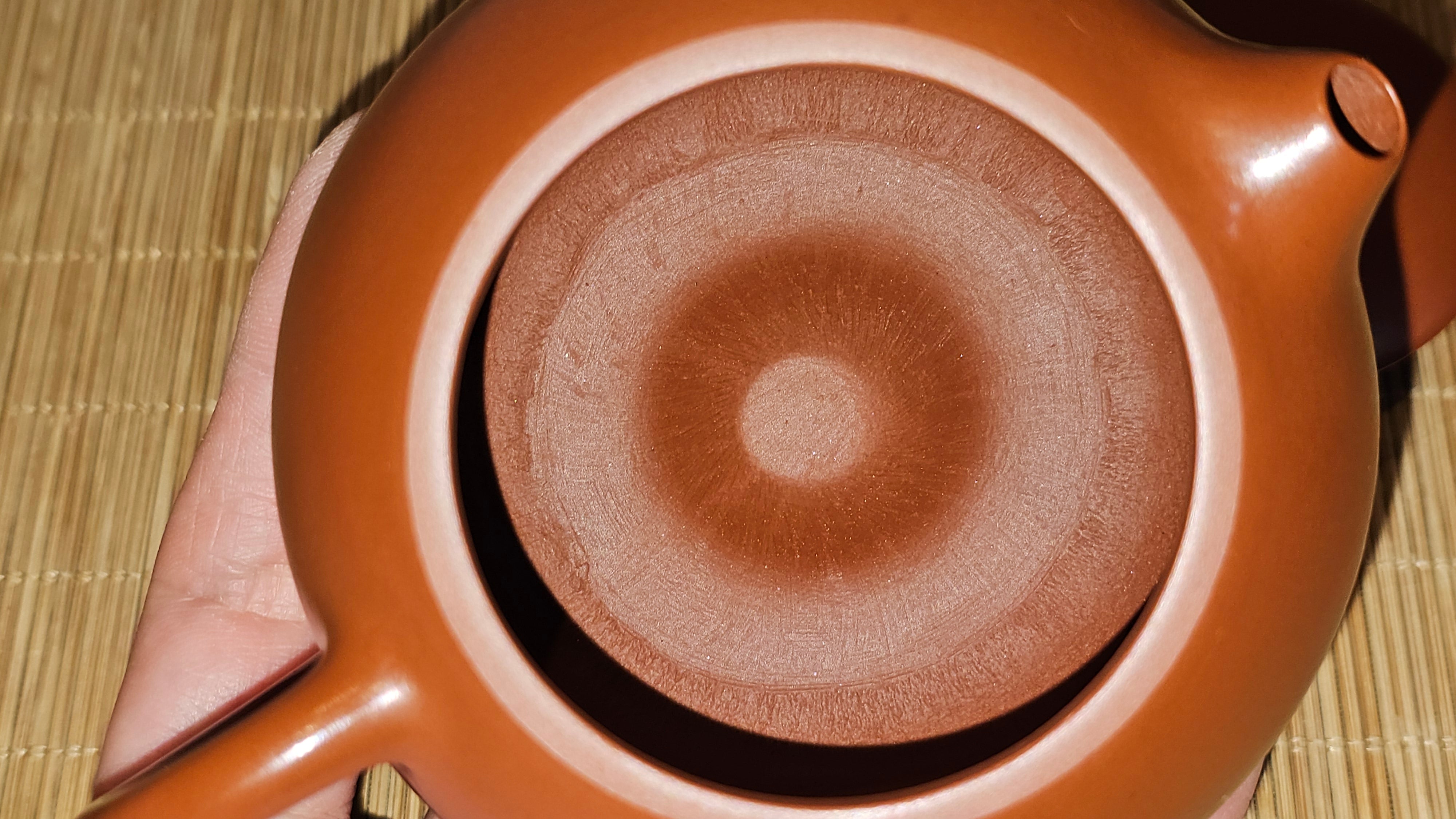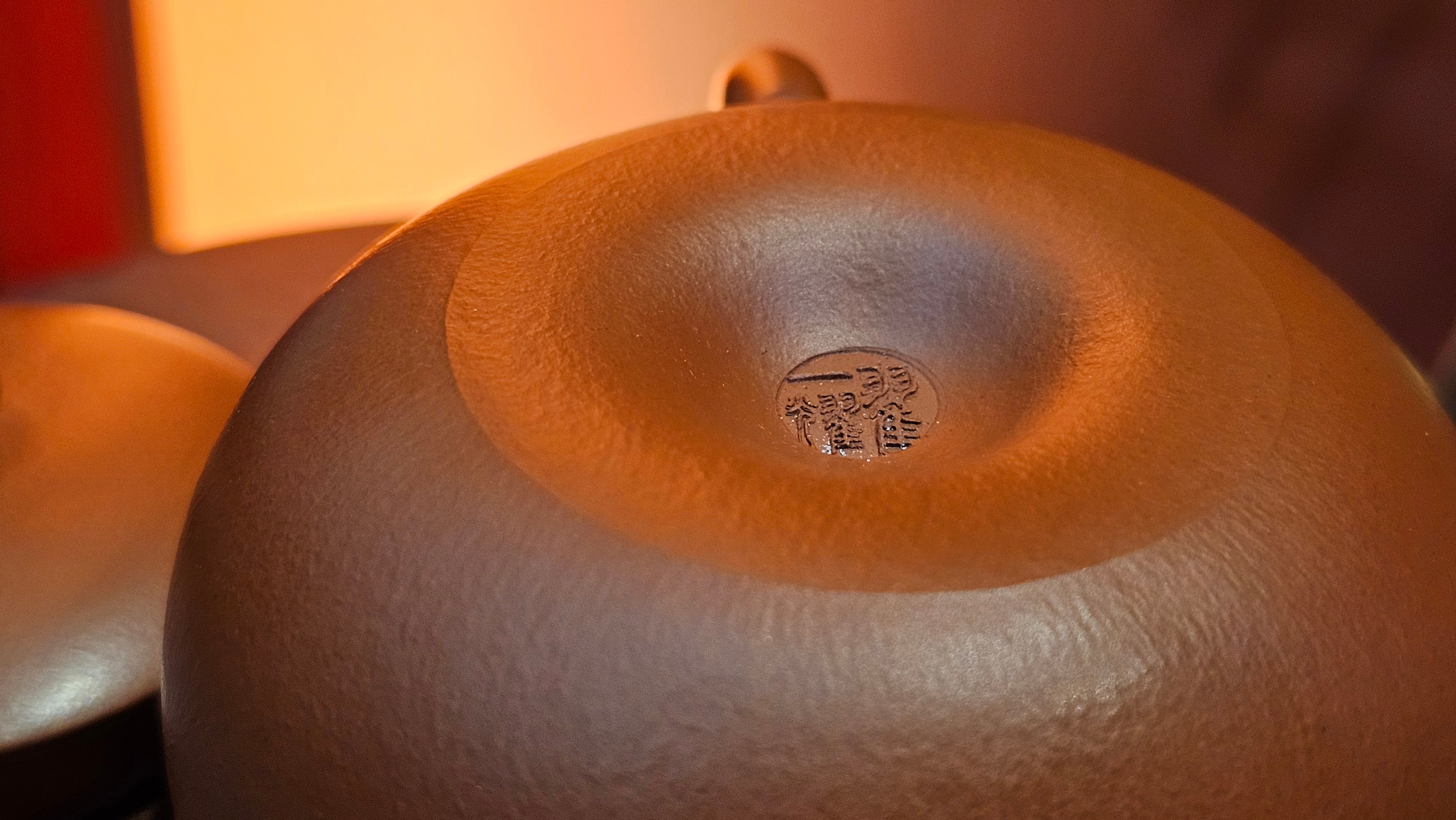 Also to be cherished and witnessed in this ZiSha Work, you : besides the usual important, critical and beautiful hallmarks of a Fully-Handmade ZiSha pot, this pot has the discontinuous and roughly horizontal marks evident on the inner walls, and these are called the: 泥凳纹 Ni Deng Wen, which are the marks left on the clay slab, complementary to the marks on the workbench of the Craftsman Zhang Wang Xing; During the making of FHM ZiSha pots, the Craftsmen will be using tools to cut the clay slabs, etc, and these cutting strokes will leave marks on the studio workbench.  Especially the first major forceful cut across the table to delineate the clay she/he wants to utilize to form the main body of the body.  Thus when the craftsman subsequently pound the clay slab on the workbench, these marks will be etched onto the clay slab.  Thus you are "enjoying" the additional natural hallmarks of a Fully-Handmade pot.  Even a partially handmade pot will not show these marks.  And those fake, those Jigger-machined pots may show CONCENTRIC continuous circular lines, usually all parallel to one another, and extremely uniform.