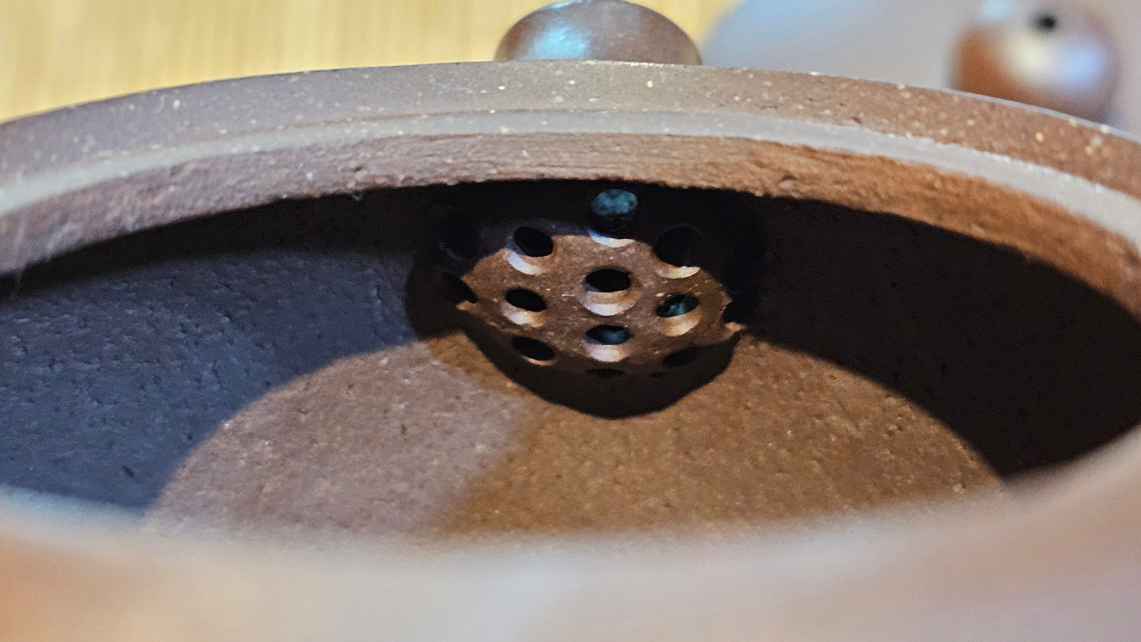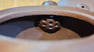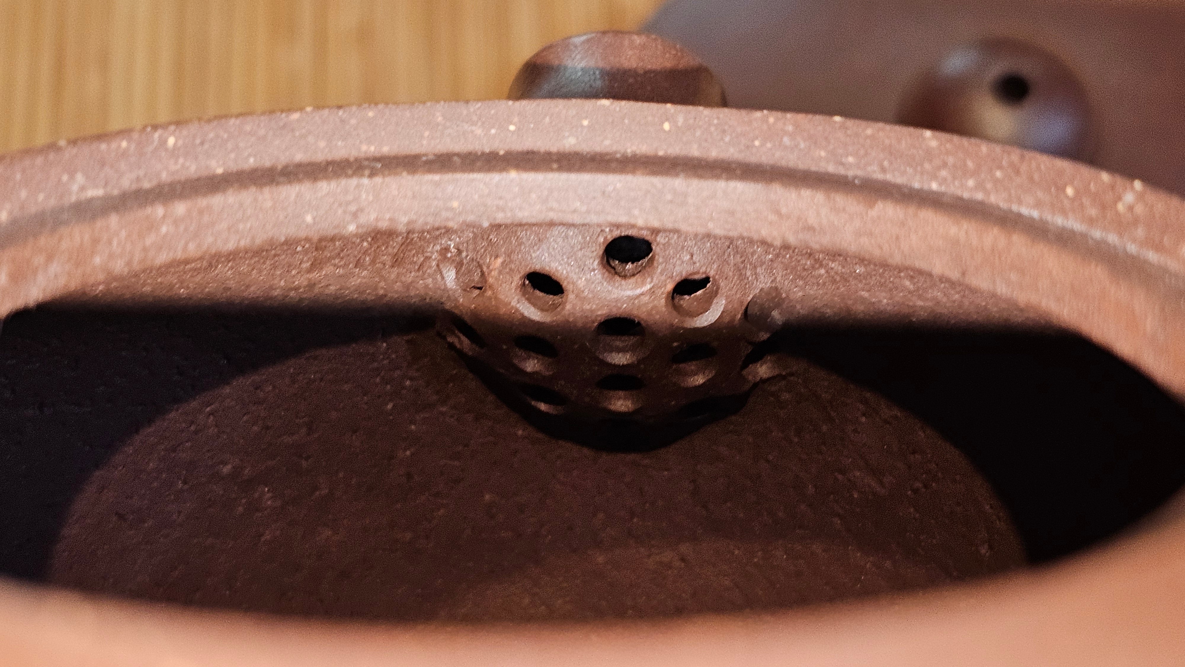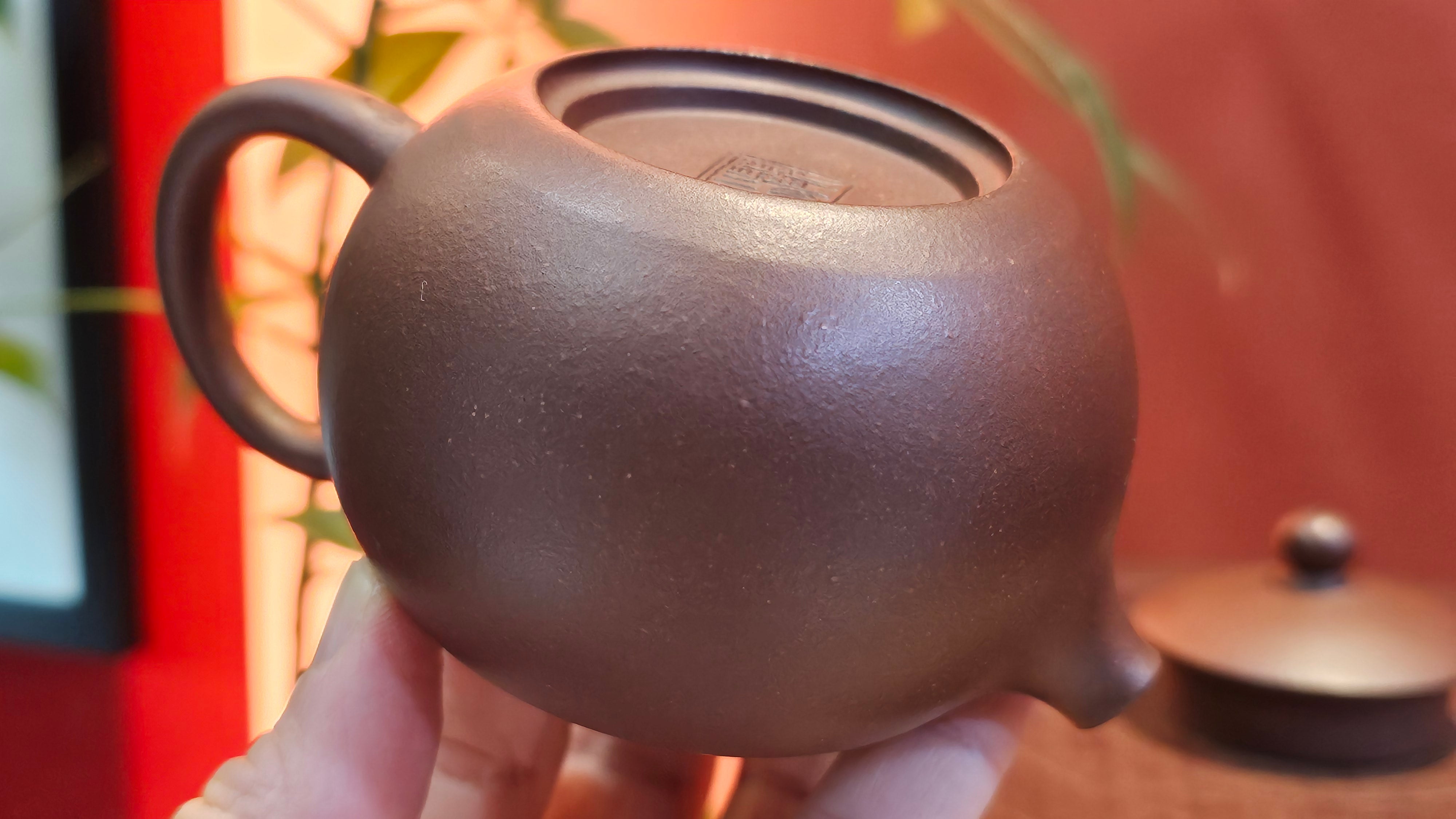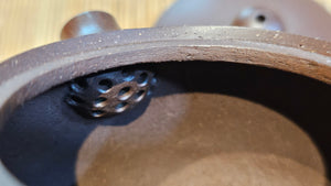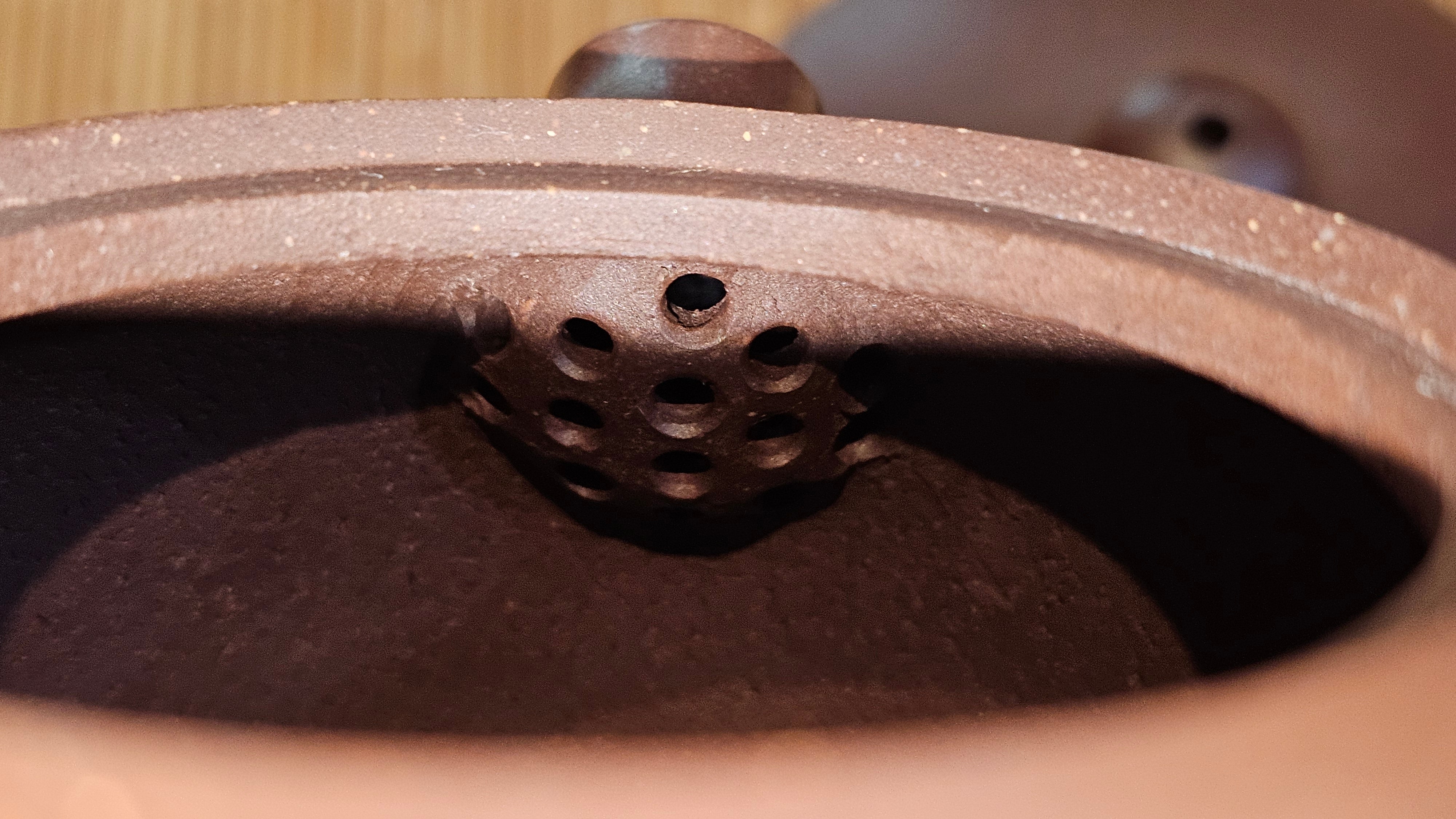 2. Craftsman Gu also conscientiously sculpted a 手推内球孔 Hand-Pushed Spherical Filter to increase the number of filter holes for a solid and fast pour of tea out and with better catching of tea leaves at the bottom fast while allowing tea to flow out from the upper holes. The Fraternity-recognised: Puffer Fish silhouette iteration of this Xi Shi spout, is also crafted here, which accommodates the more generous lumen/outflow, FURTHER accentuating and aiding the swiftness of pour.